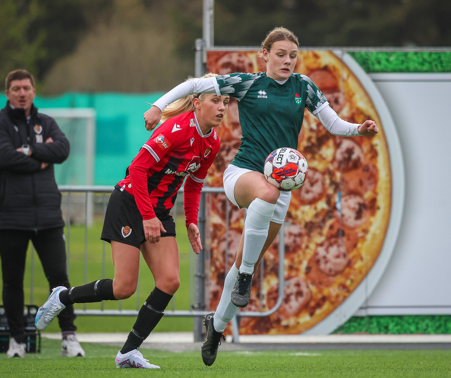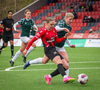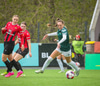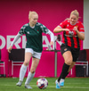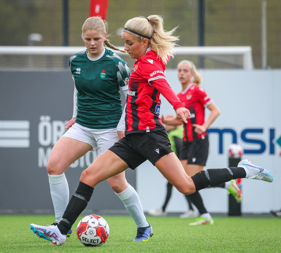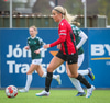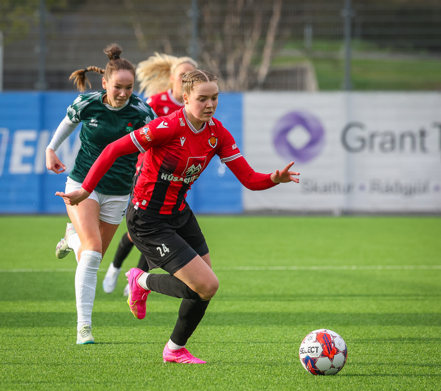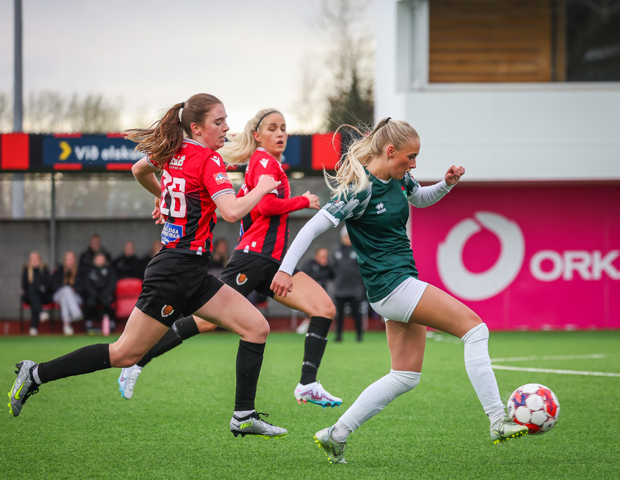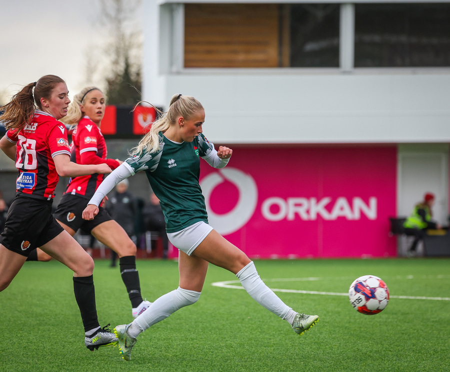 Sigdís enn og aftur að fara illa með Söru úti vinstra megin. Hún keyrir inn á teiginn og tekur skotið rétt yfir