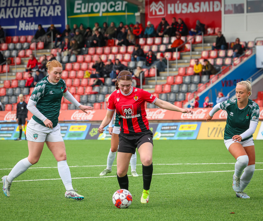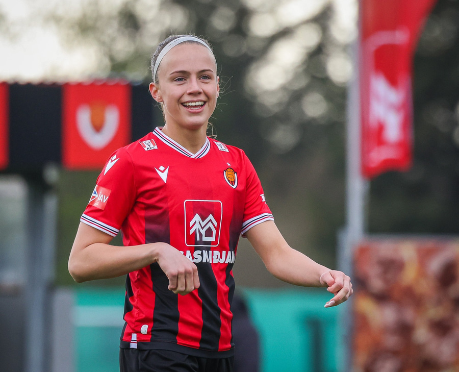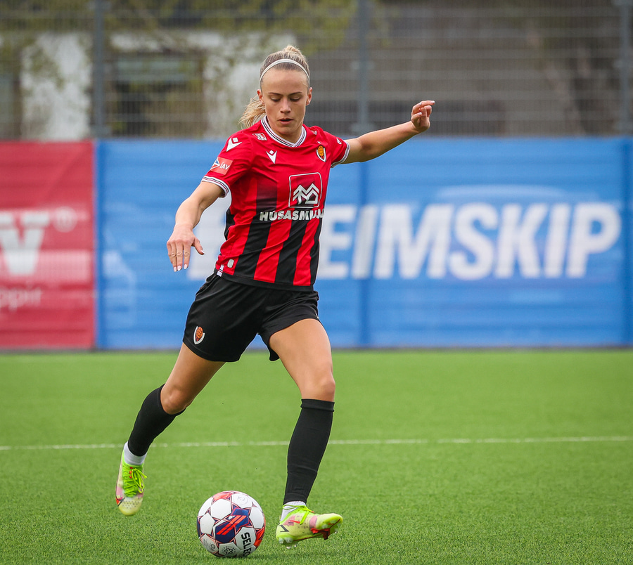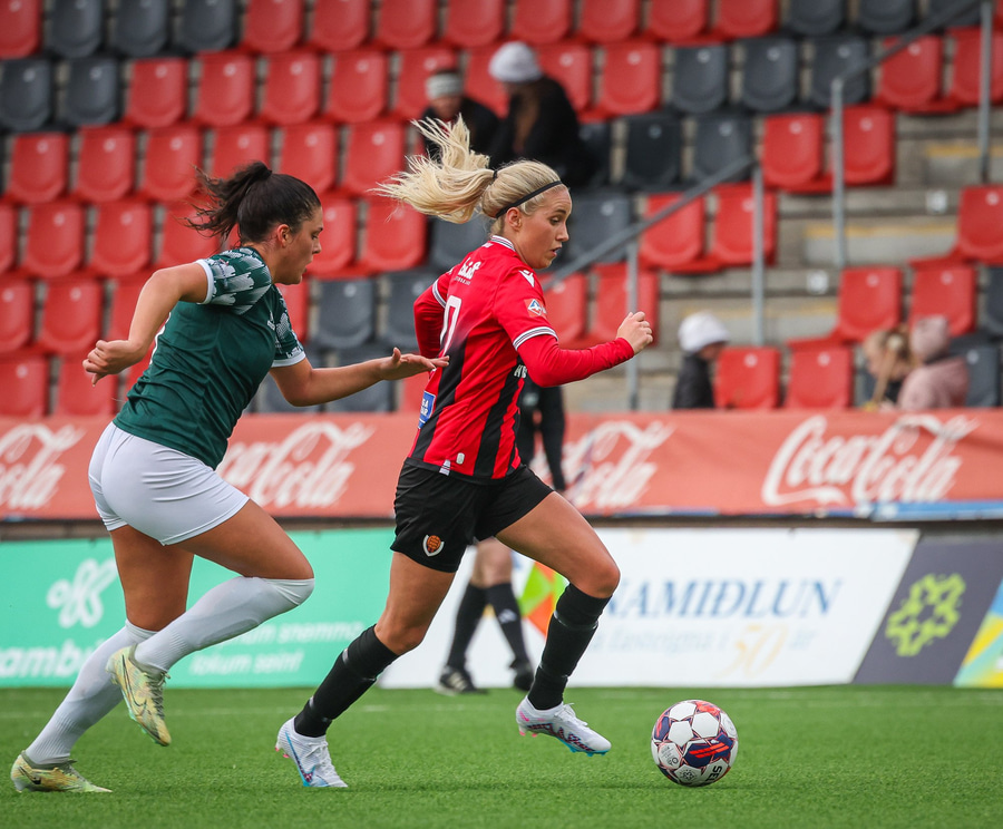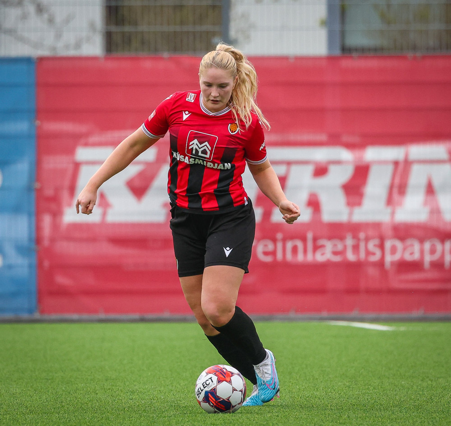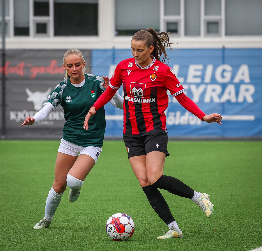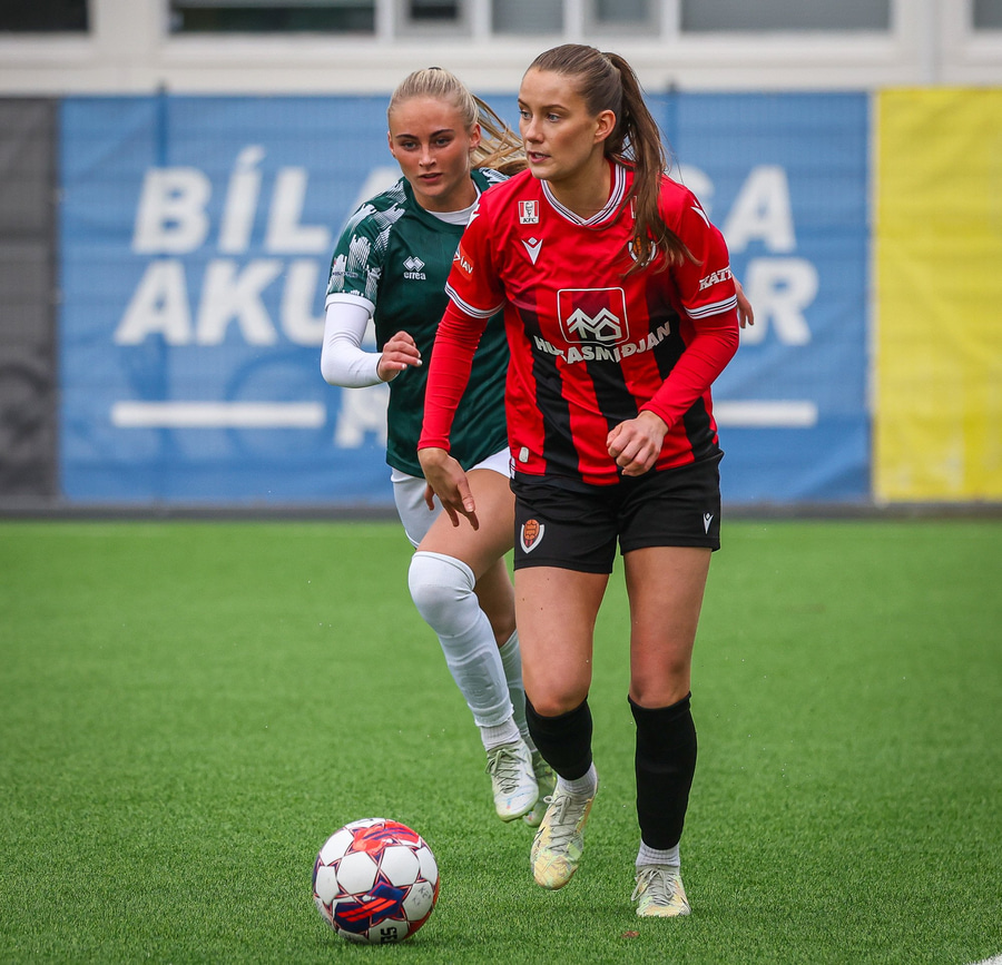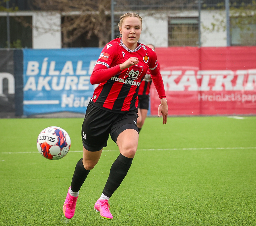 Emma með geggjaðan bolta niður kanntinn á Sigdísi sem kemur með geggjaðan bolta út í teig á Nadíu sem tekur skotið rétt fram hjá! Það munaði sáralitlu að þessi hefði farið inn!