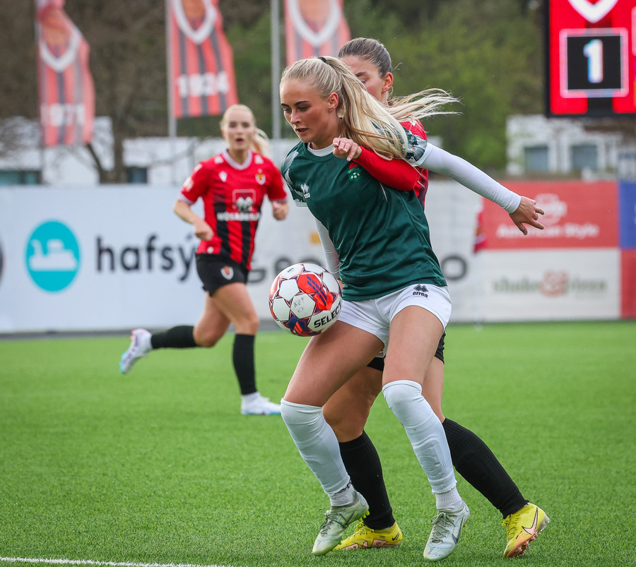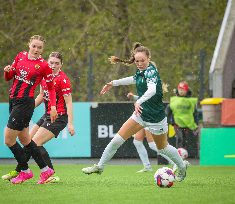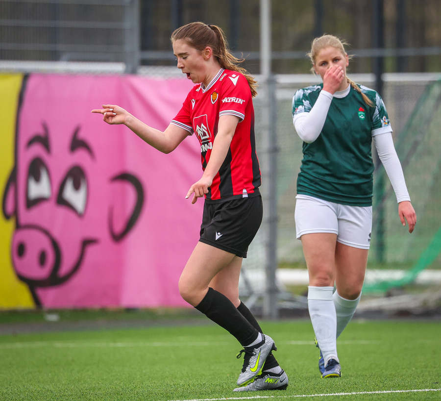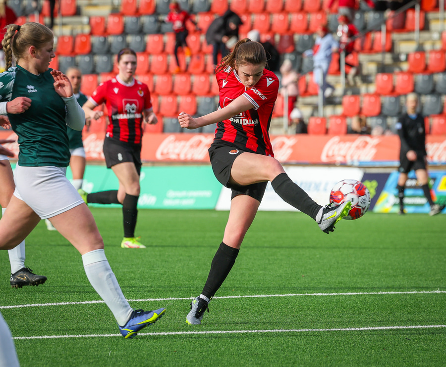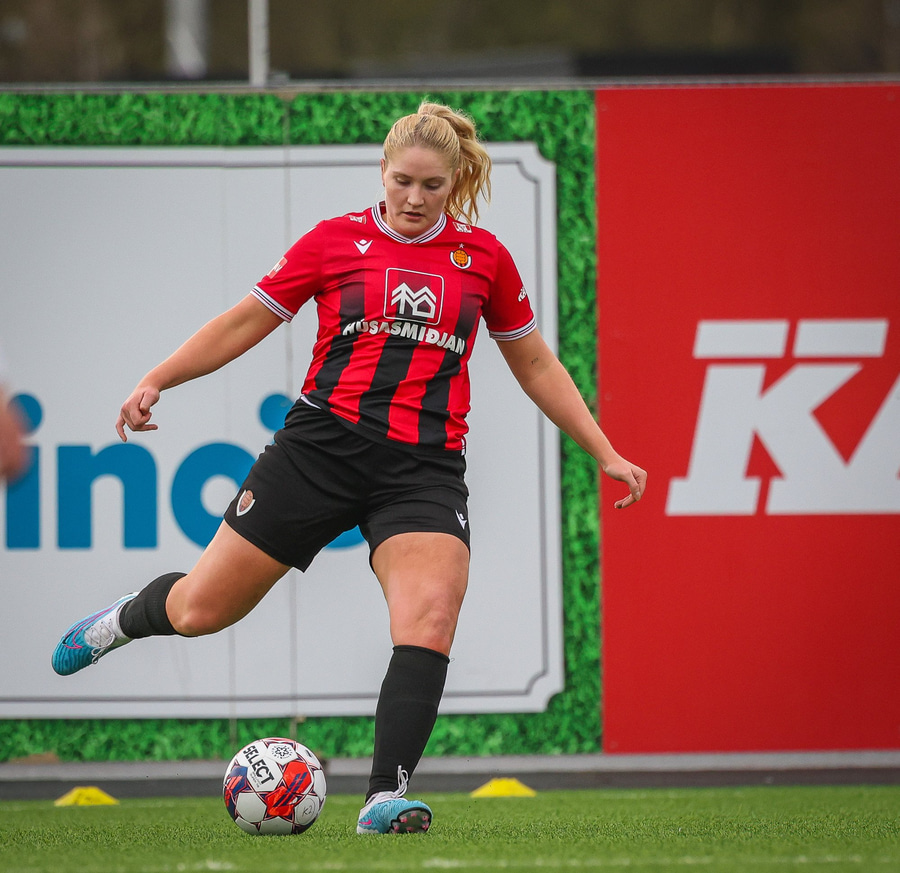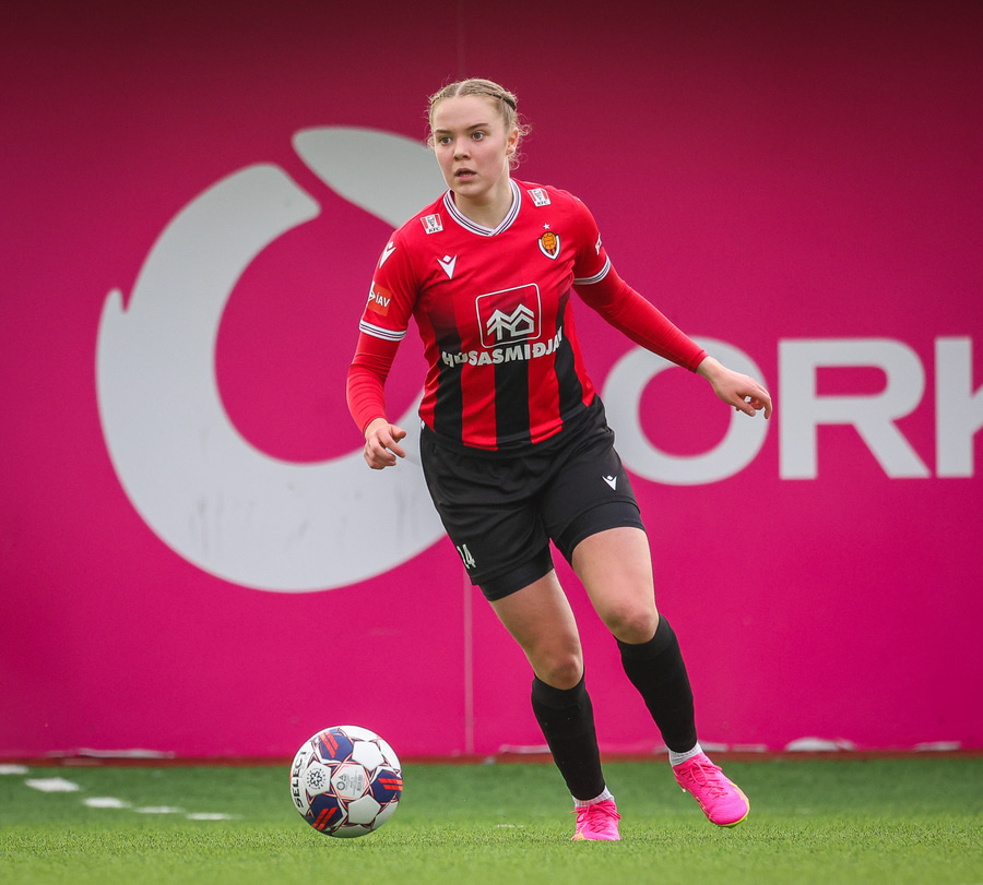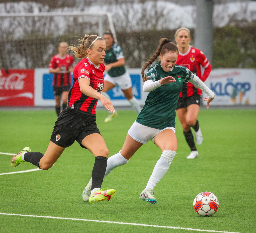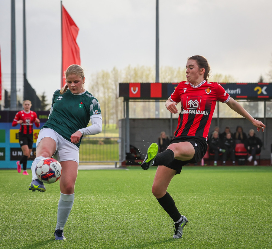 Emma með geggjaðan bolta niður kanntinn á Sigdísi sem kemur með geggjaðan bolta út í teig á Nadíu sem tekur skotið rétt fram hjá! Það munaði sáralitlu að þessi hefði farið inn!