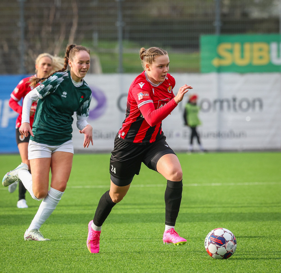 Og þar með flautar Nour þetta í hálfleik. Víkingar hafa verið með yfirhöndina allan leikinn. Það var með hreinum ólíkindum að staðan hafi ennþá verið 1-0 eftir 10 mínútur. En Augnablikskonur unnu sig aðeins inn í leikinn seint í fyrri hálfleik. Þær komu með ágæta bolta fyrir og áttu eitt langskot. En Víkingskonur leiða 2-0 í hálfleik.