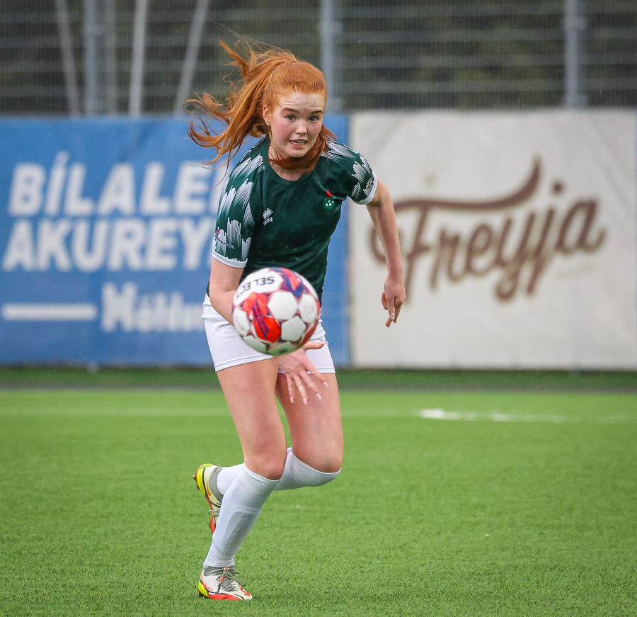 Emilía með ágætan bolta inn í á Díönu frá hægri en Sigurborg stekkur í þetta og kemur boltanum í spil.