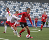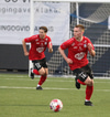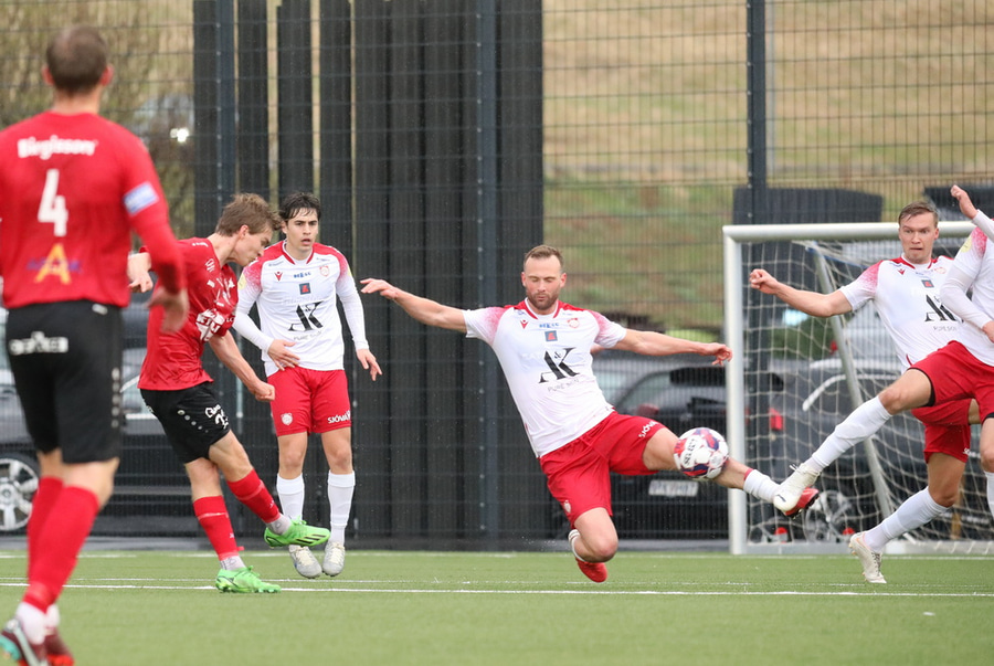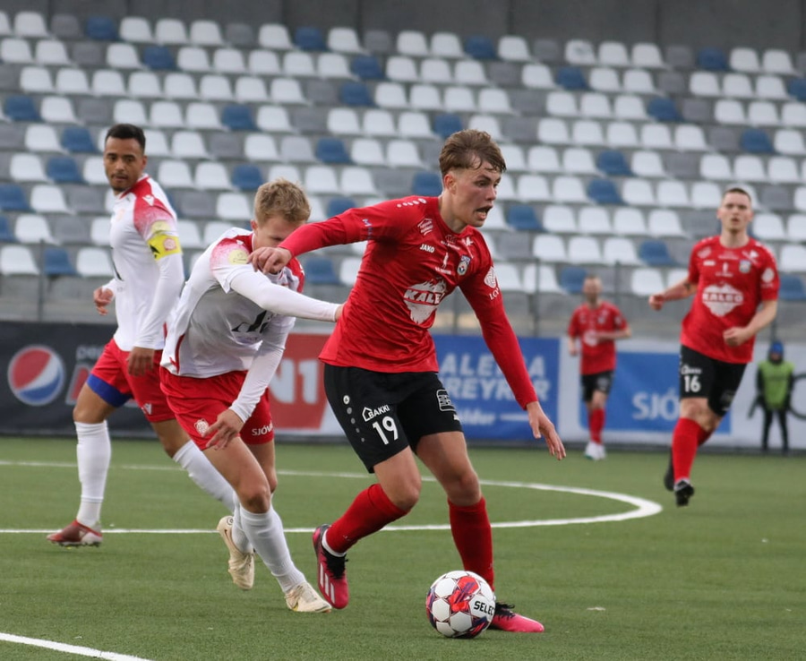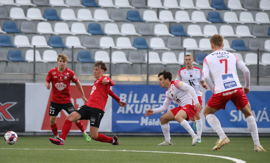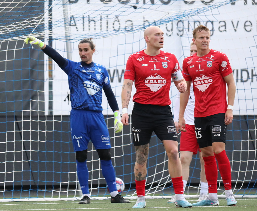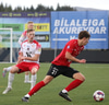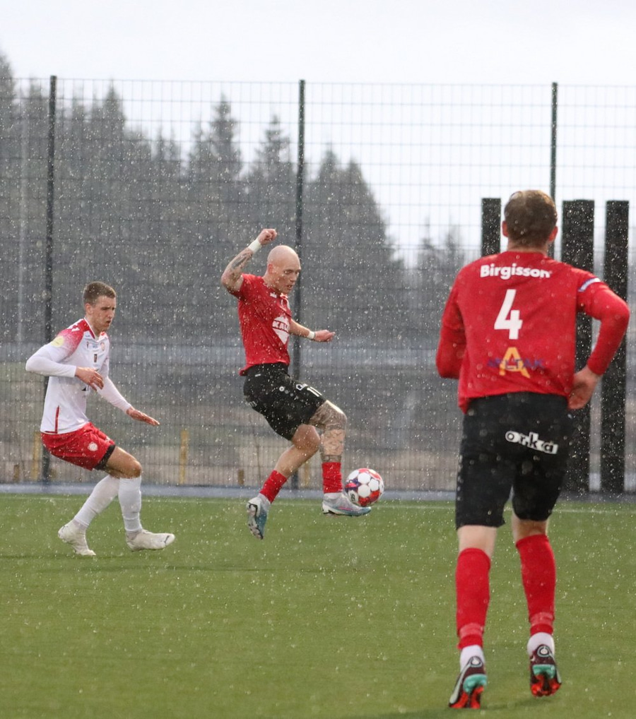 Bjarni Páll nær hér virkilega góðri fyrirgjöf sem fer beint á skallann á Arnóri Gauta sem gerir vel en boltinn fer rétt framhjá.