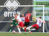 Sævar Atli með skot af 30 metrunum sem er mjög fast og Aron Birkir þarf að hafa sig allan við að blaka þessu yfir markið!