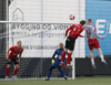 Ásgeir tekur hornspyrnuna og Gunnar Bergmann rís hæst í teignum og nær skalla sem er fastur og Aron Birkir ræður ekki við þetta.