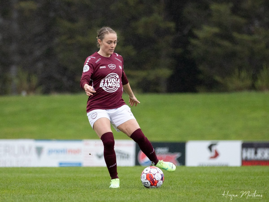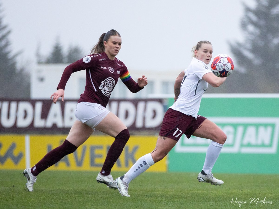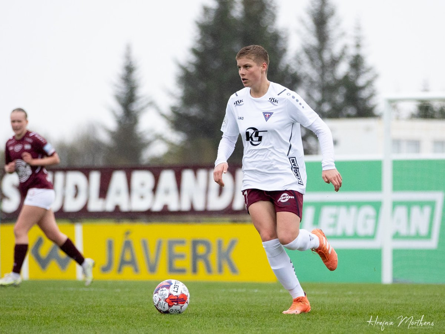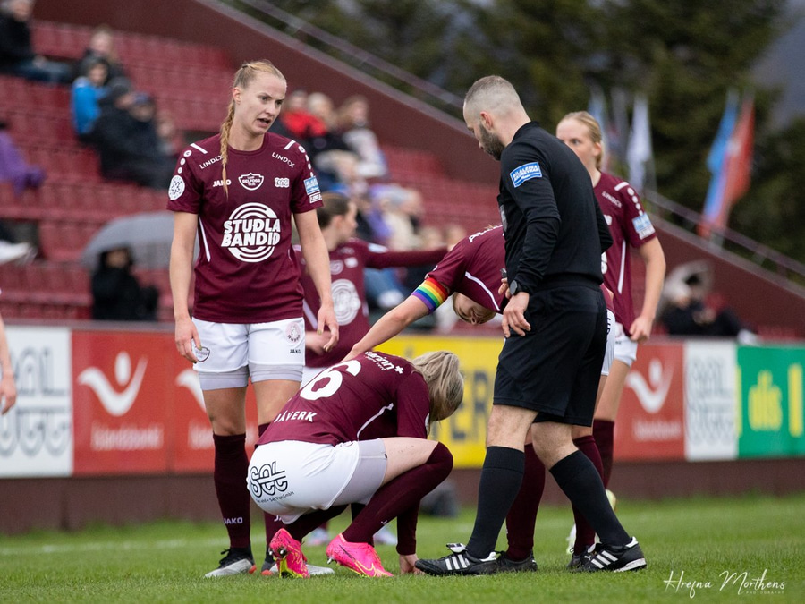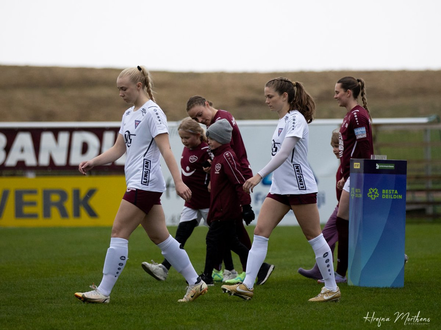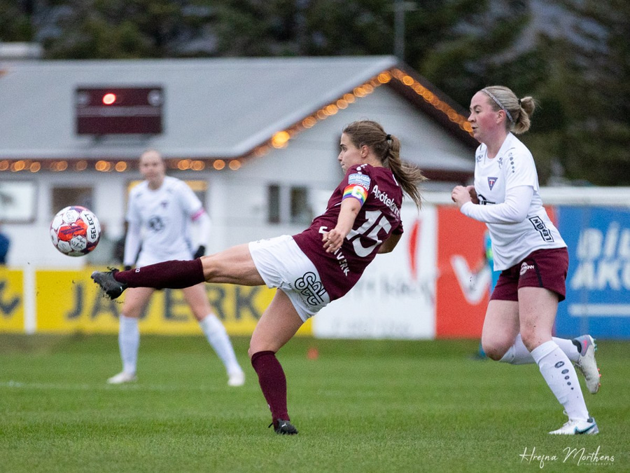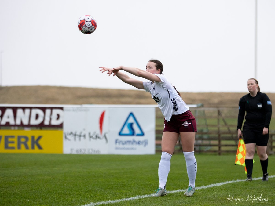 Sif Atla hleypur upp hægri kantinn og kemur með fyrirgjöf á Guðrúnu Þóru sem skallar boltann í varnarmann hann fer aftur fyrir endalínu í horn.