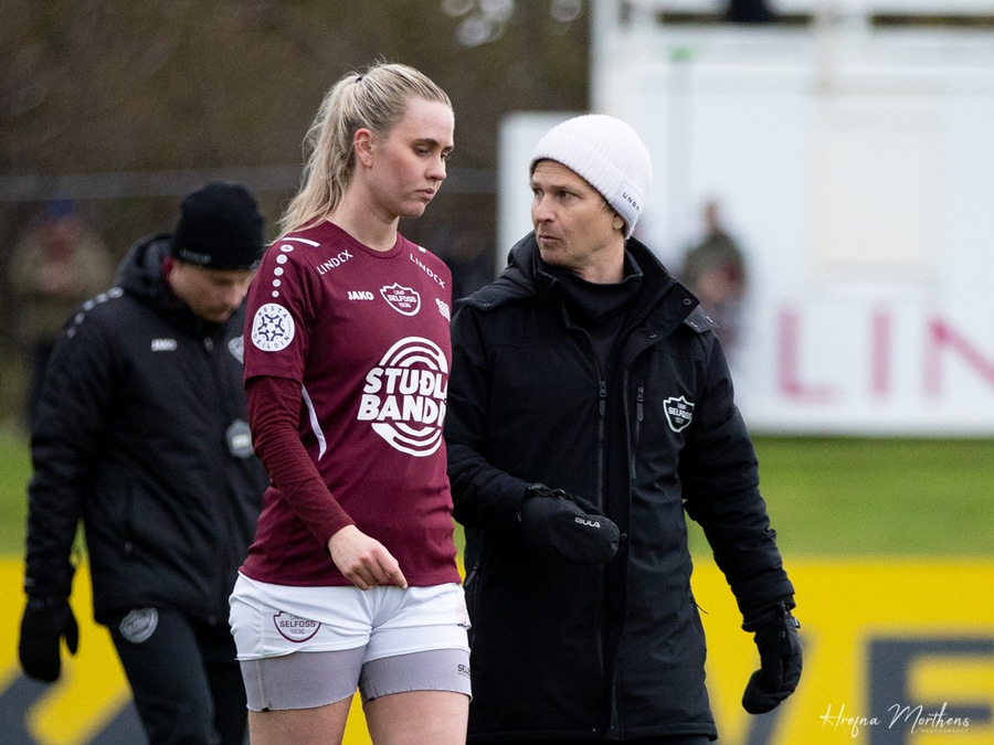 Monica fær bolta til baka og missir einbeitingu og tekur boltann upp. Selfyssingar fá óbeina aukaspyrnu að launum.