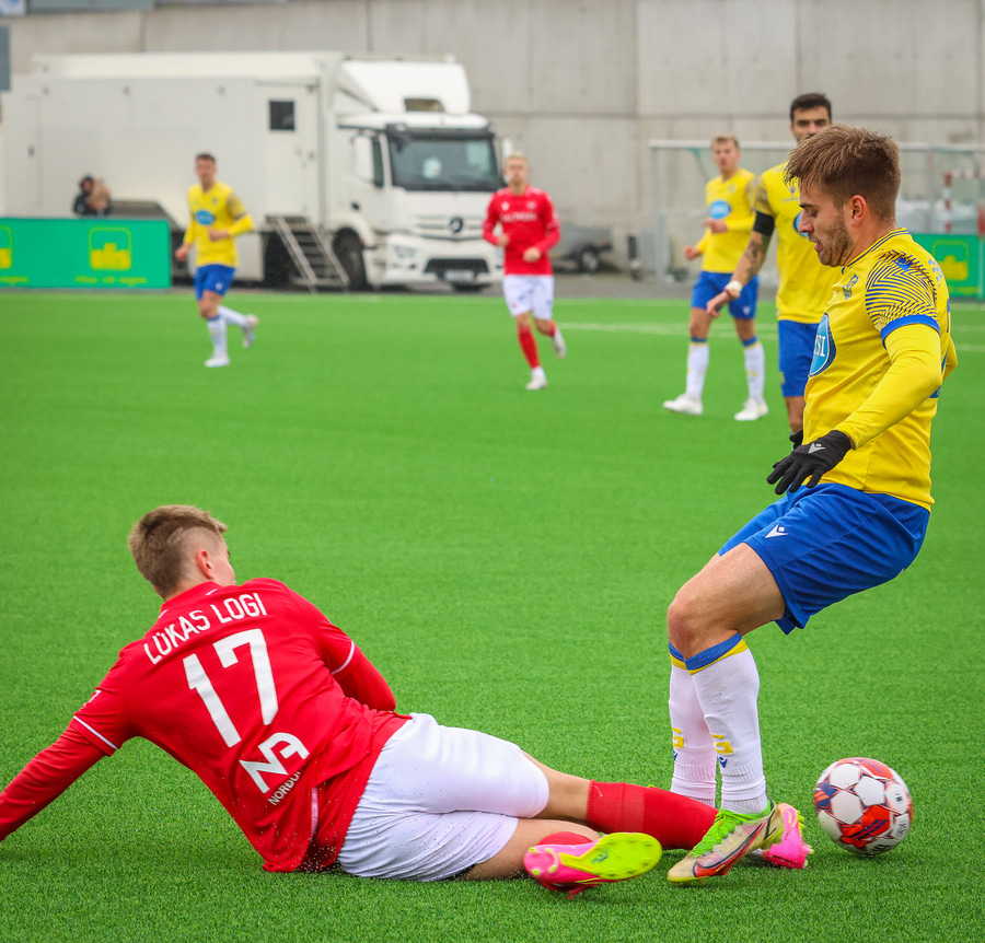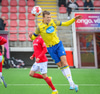Kristinn Freyr reynir stungusendingu á Tryggva Hrafn en Aron Dagur vel á verði og kemur út og handsamar boltann.