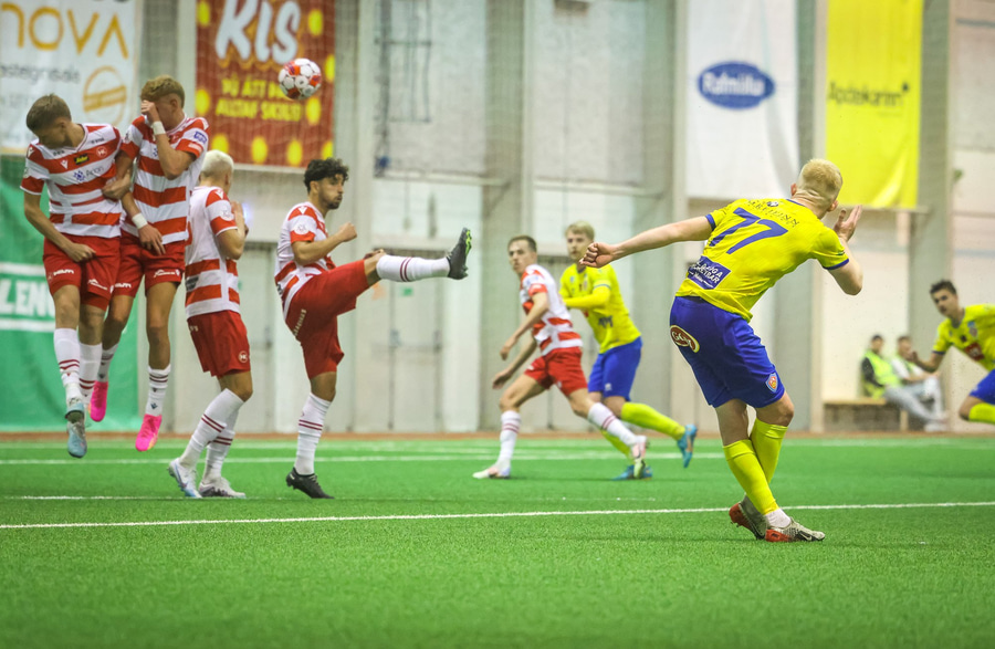 Hallgrímur tekur aukaspyrnuna sjálfur og reynir skotið. Skotið fer af afturendanum á Ívari Erni og þaðan í netið.