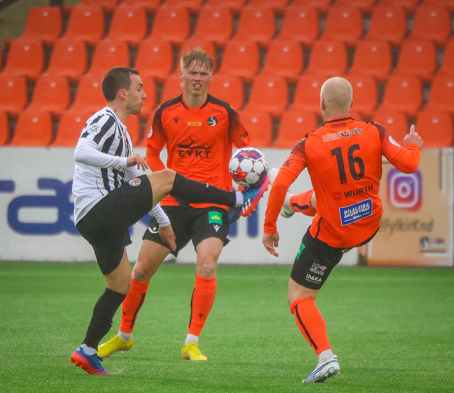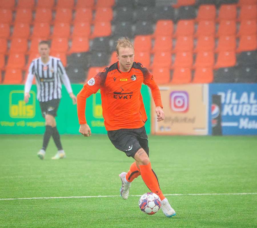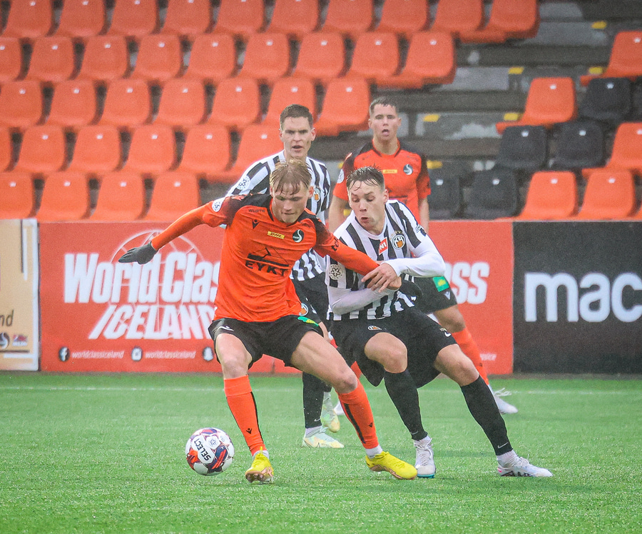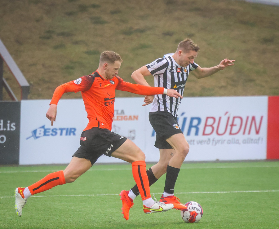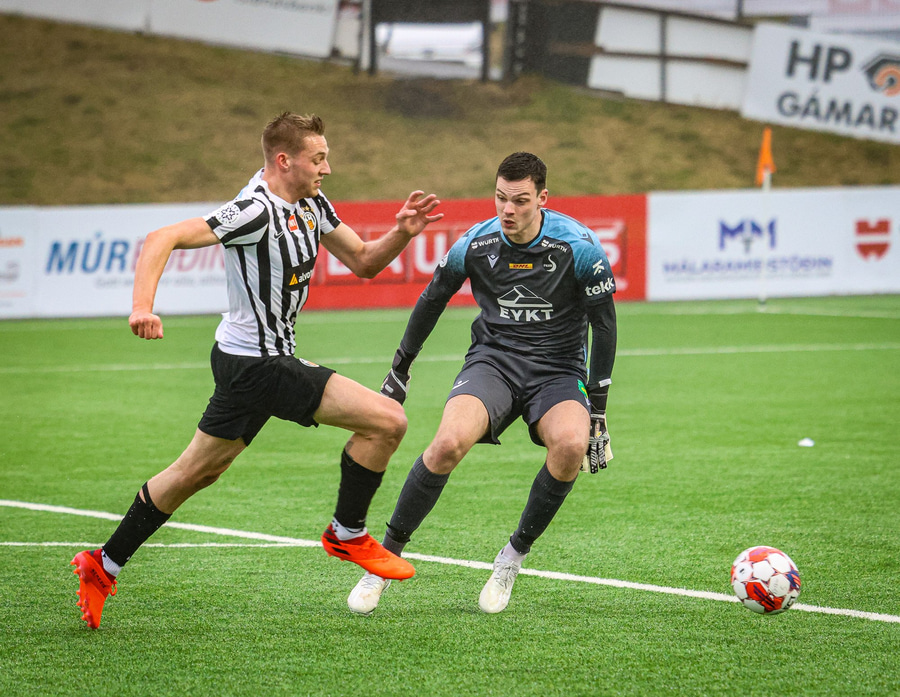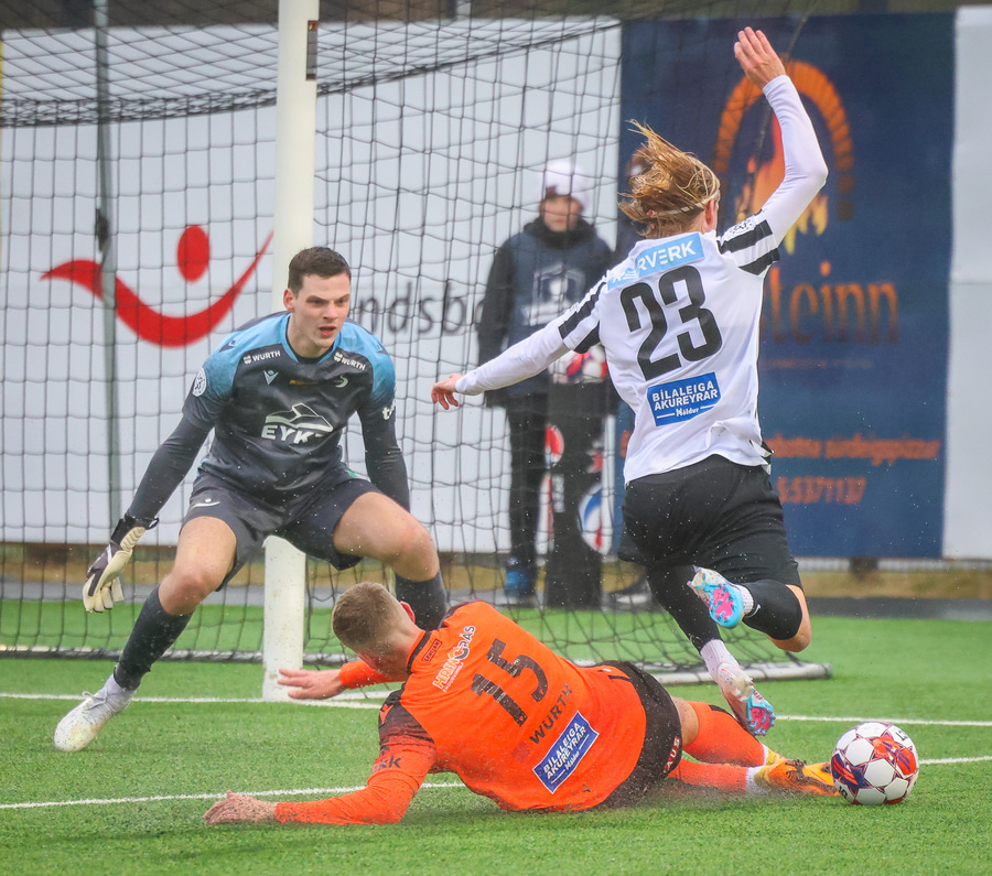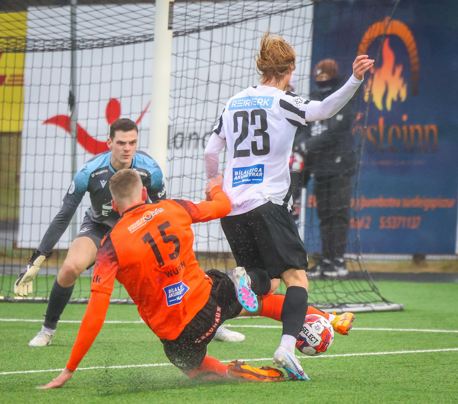 Benedikt Daríus með fínan sprett upp vinstri kantinn. Hann kemur með boltann fyrir sem Jakob nær að hreinsa í innkast.