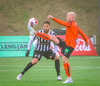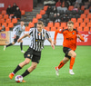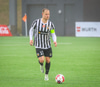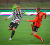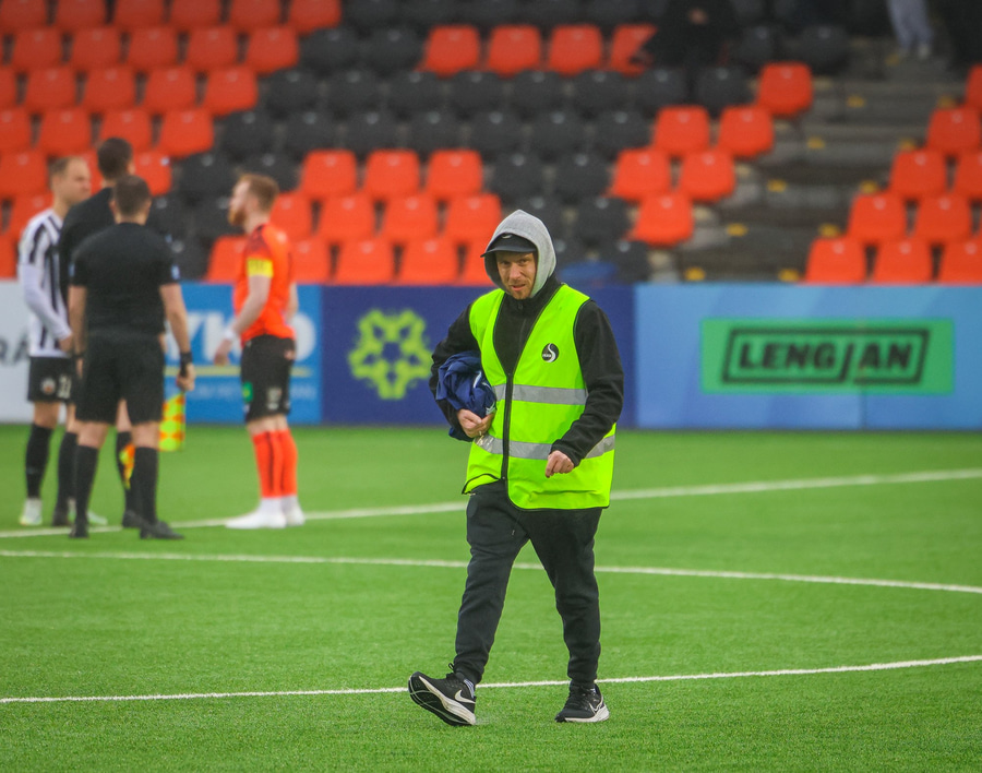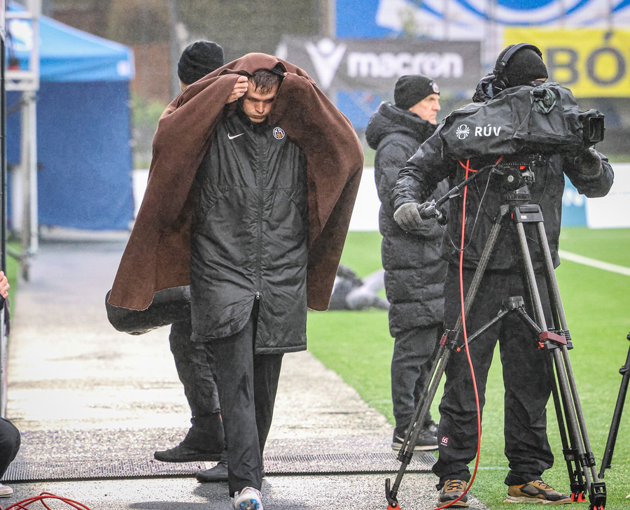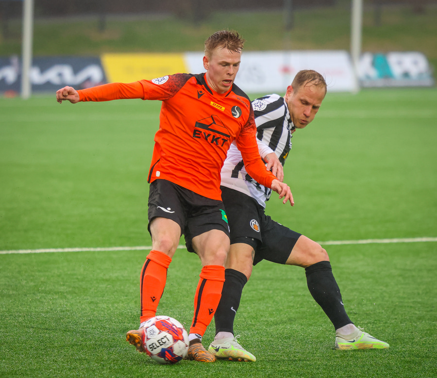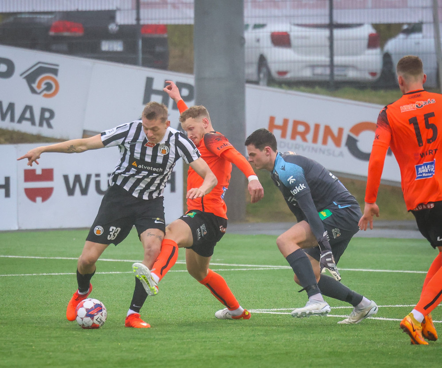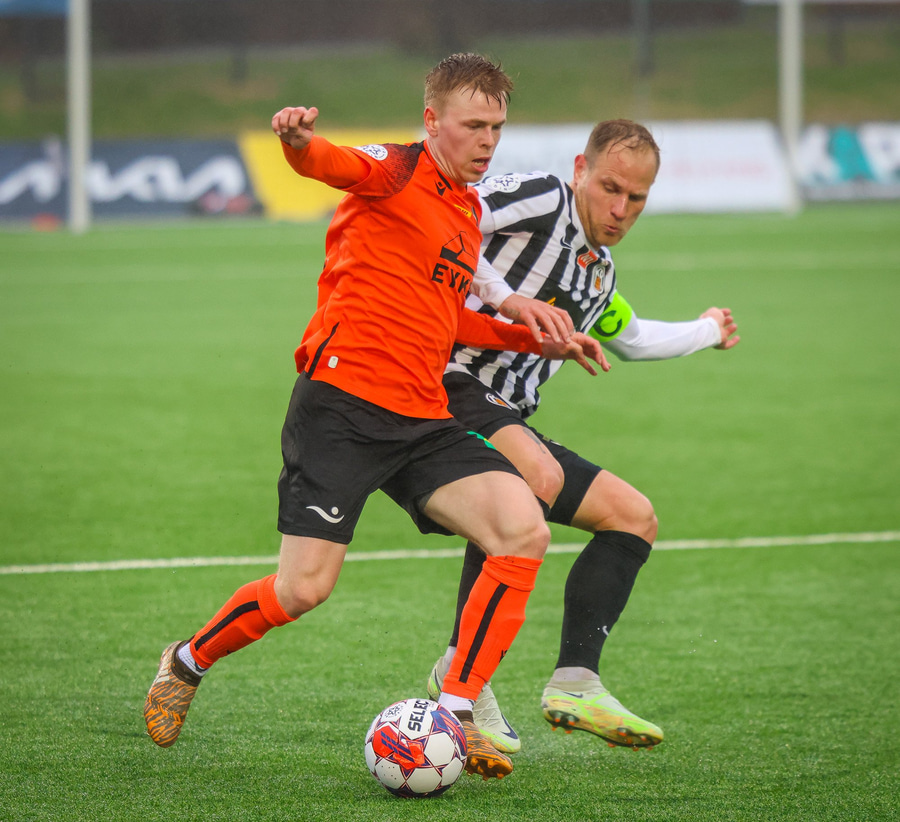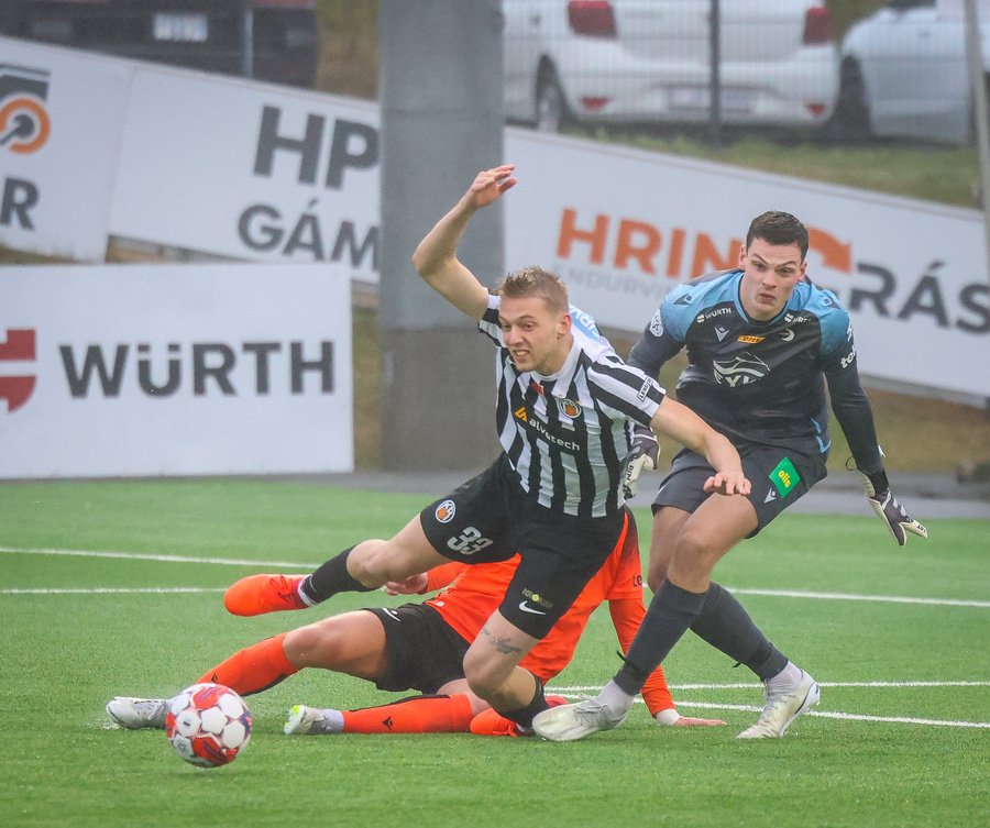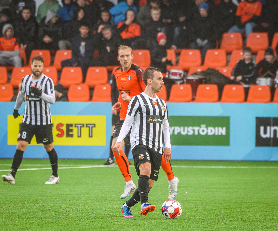 Benedikt Daríus með fínan sprett upp vinstri kantinn. Hann kemur með boltann fyrir sem Jakob nær að hreinsa í innkast.