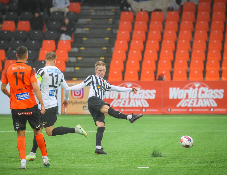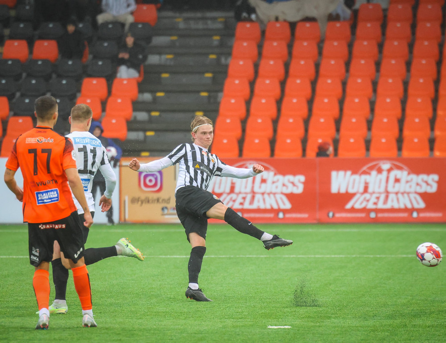 Óskar Borgþórsson með tilraun utan að teig sem fer mjög hátt yfir.