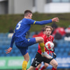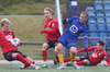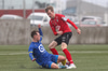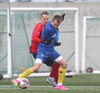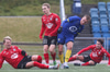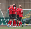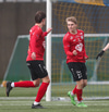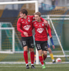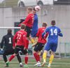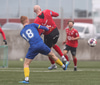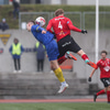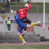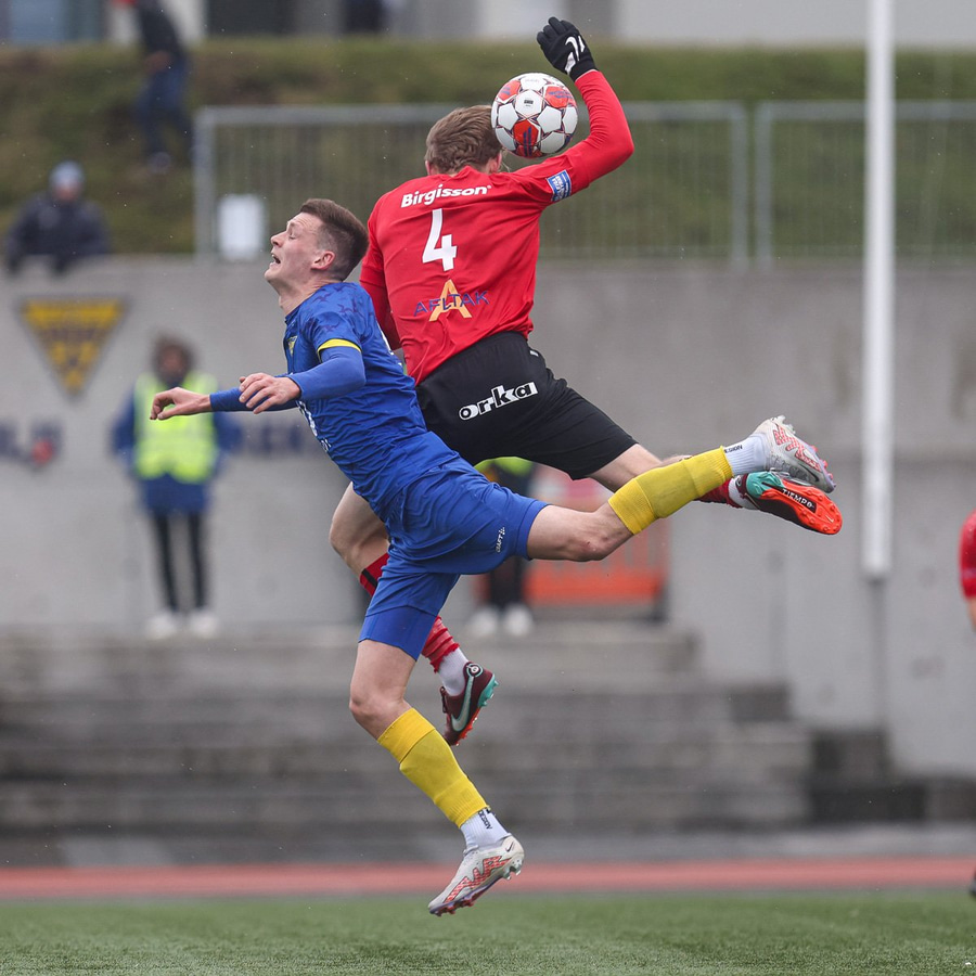Pétur Theódór að skalla boltann inn í markið eftir fyrirgjöf inn í teig. Arnór Gauti reynir að skalla boltann í burtu, en nær ekki að hoppa hærra en Pétur.