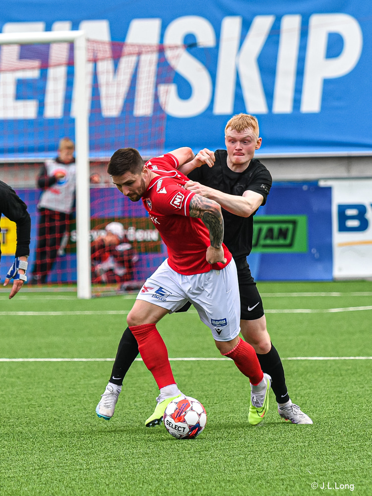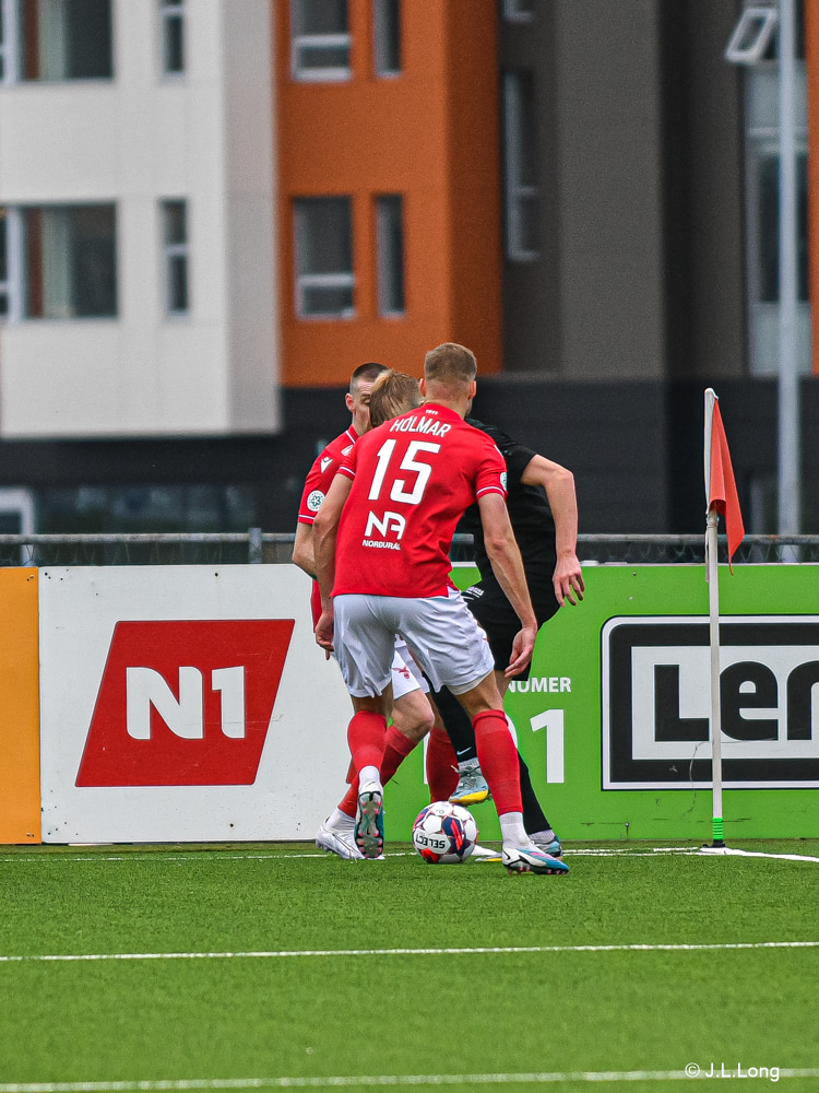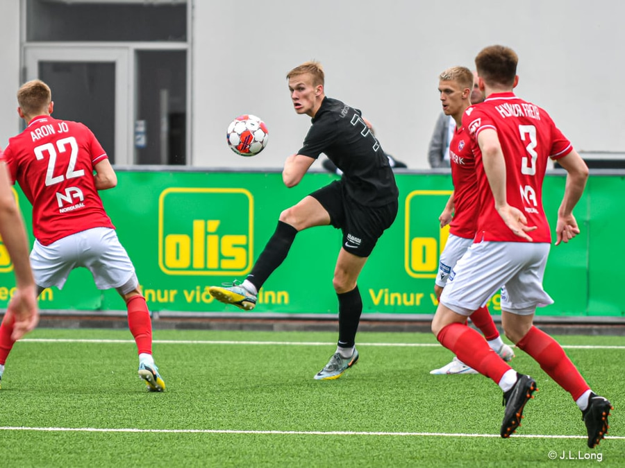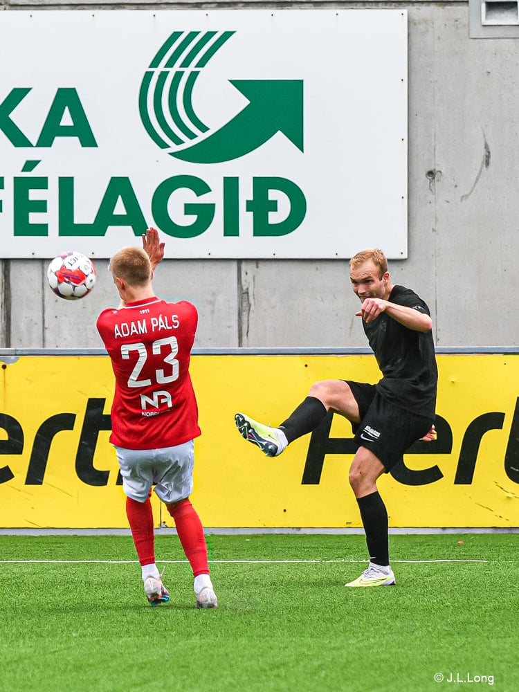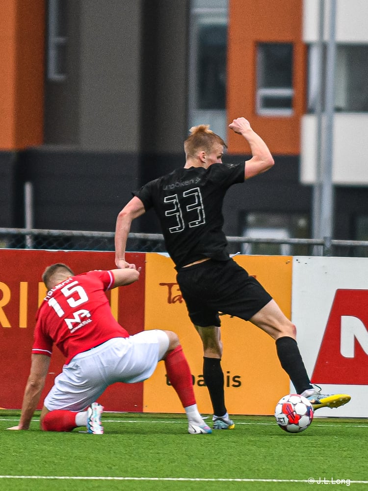Logi Hrafn fær boltann eftir innkast og finnur Jóhann Ægi sem á slæma snertingu og Tryggvi Hrafn kemur eins og elding og kemst í boltann og var á leiðinni í átt að marki og Jóhann Ægir klippir hann niður.
