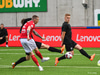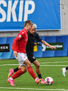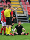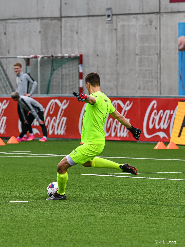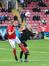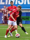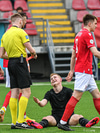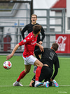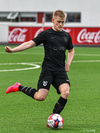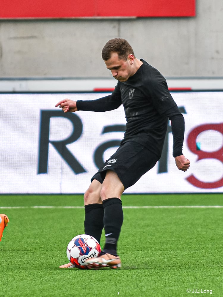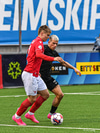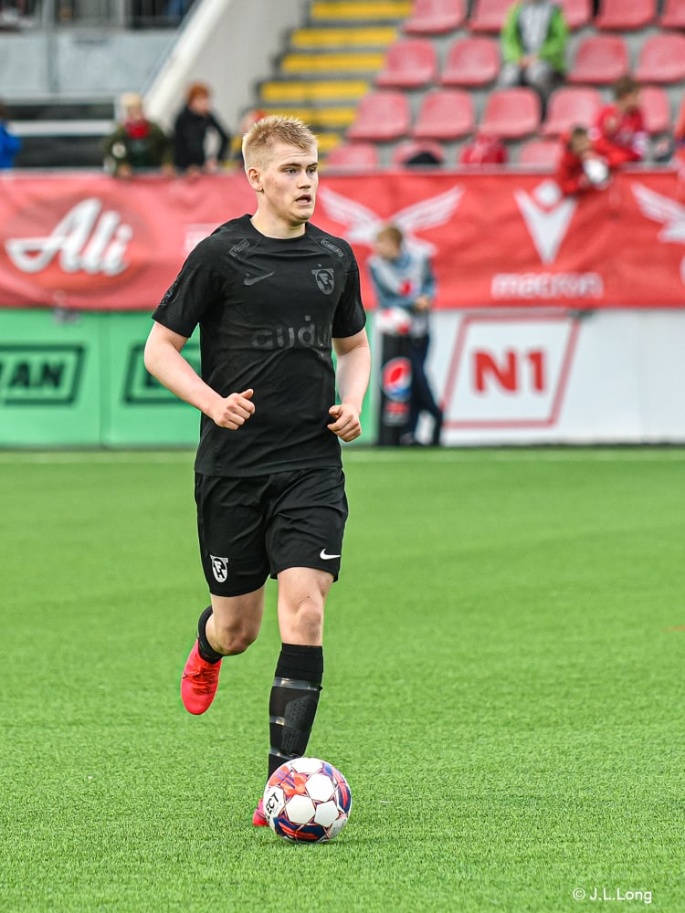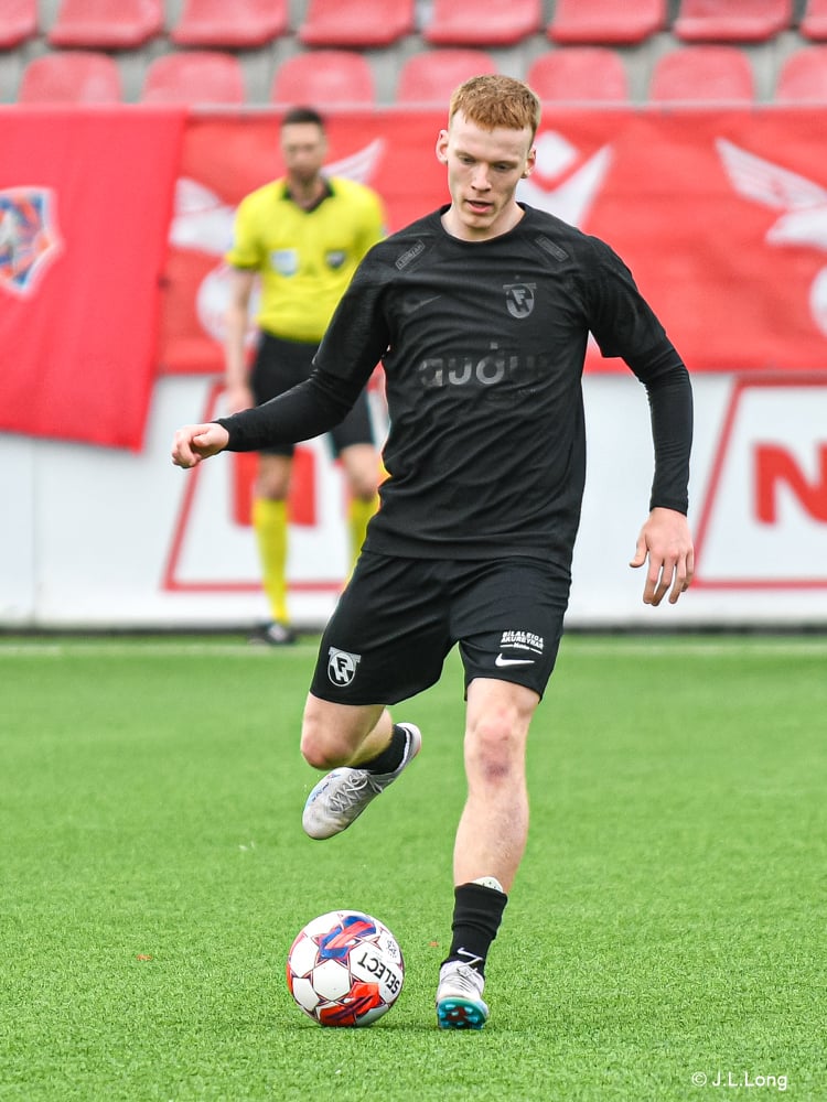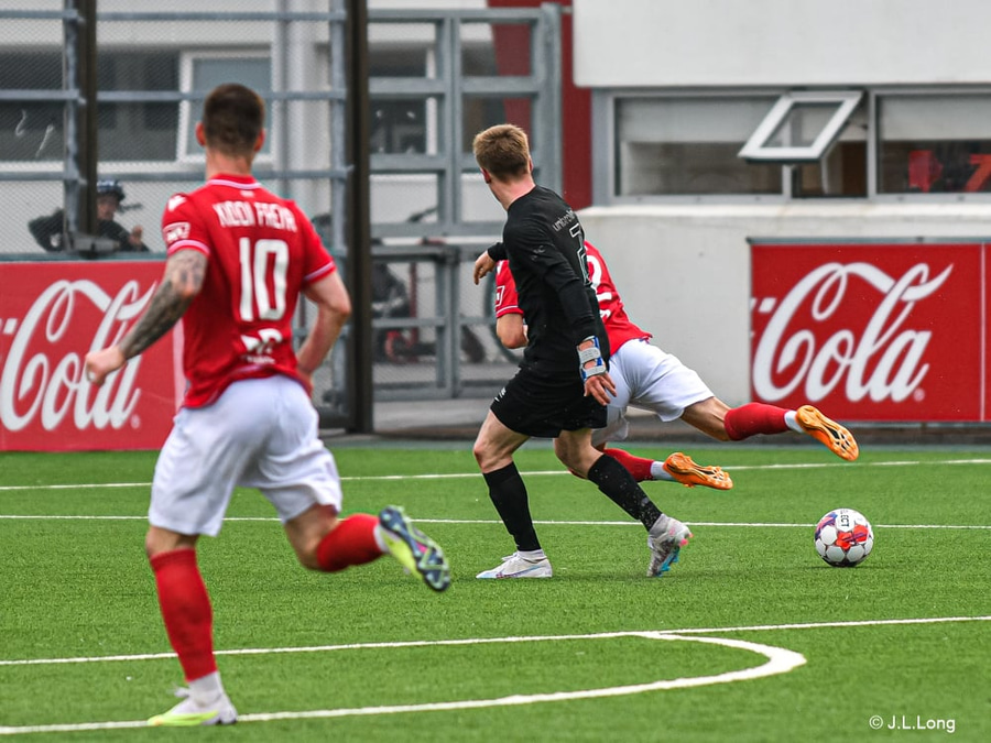 Logi Hrafn fær boltann eftir innkast og finnur Jóhann Ægi sem á slæma snertingu og Tryggvi Hrafn kemur eins og elding og kemst í boltann og var á leiðinni í átt að marki og Jóhann Ægir klippir hann niður.