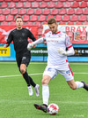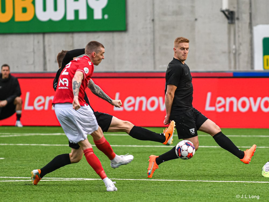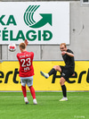 Kristinn Freyr fær boltann innfyrir frá Orra en nær ekki að setja boltann í netið úr þröngri stöðu og boltinn í hliðarnetið.