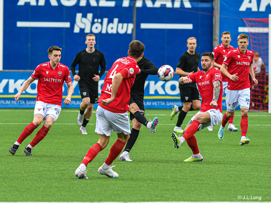 Hlynur Freyr með frábæran bolta inn á teiginn á Tryggva Hrafn ne Jóhann Ægir með góðan varnarleik.
