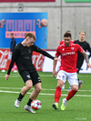 Logi Hrafn er á leiðinni að marki Val og Hlynur tæklar hann niður.