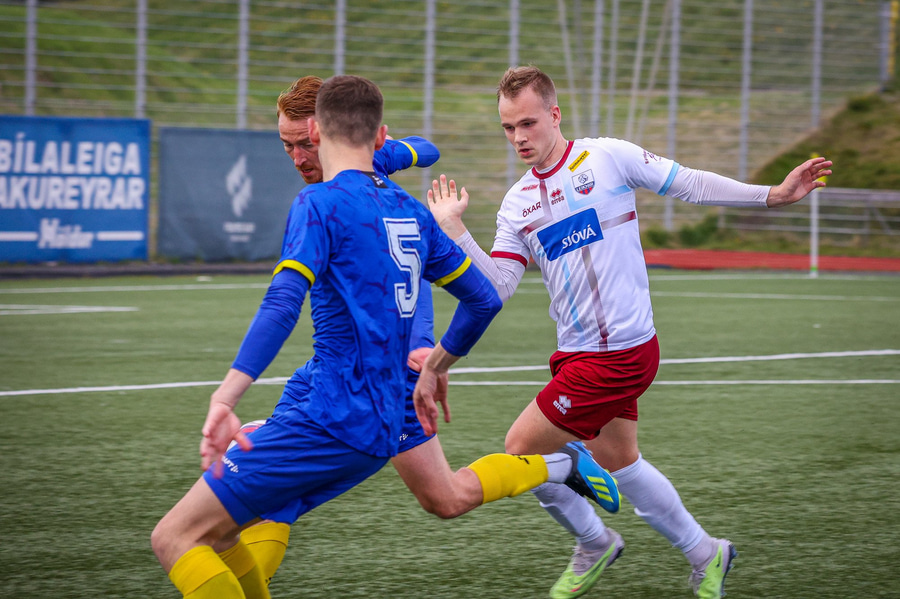 Tómas með mjög flott hlaup upp að teignum. Hann leggur boltanum til vinstri á Sigurð Steinar sem kemur sér að markinu og tekur skotið sem Viktor ver. Boltinn lendir svo á fætur Pétur Theódór sem virðist vera með opið mark, en með öllum ólíkindum nær Viktro Freyr að verja skotið frá Pétri.