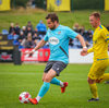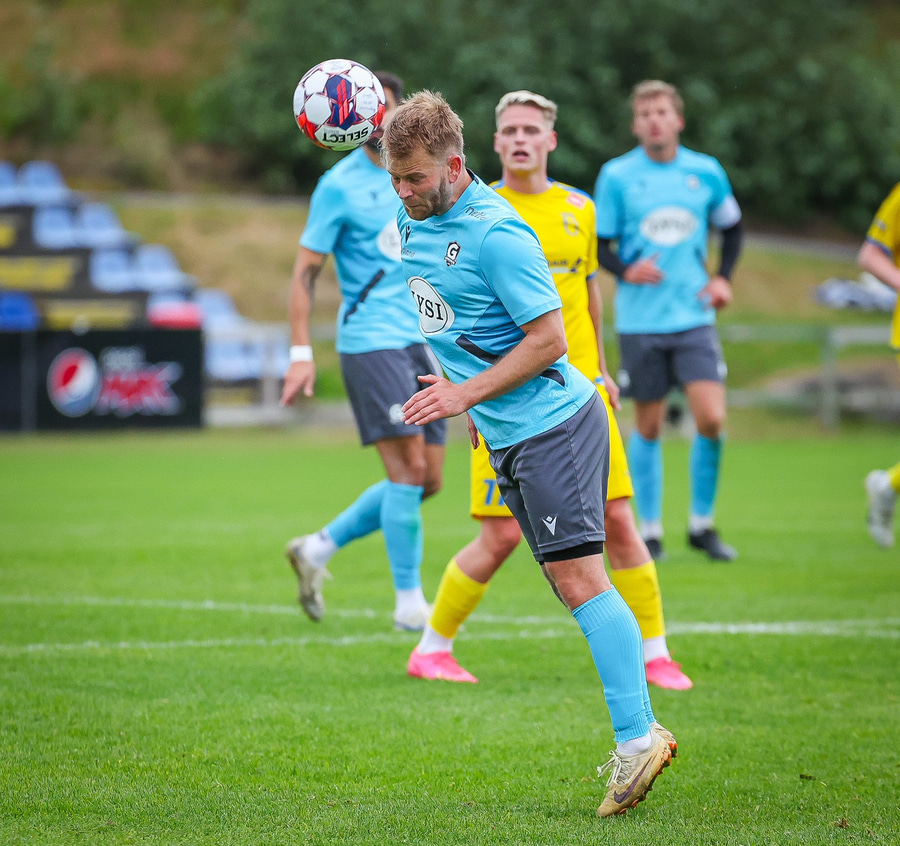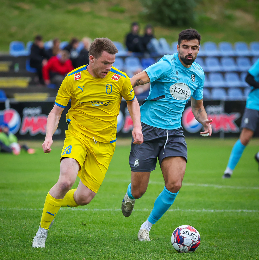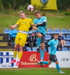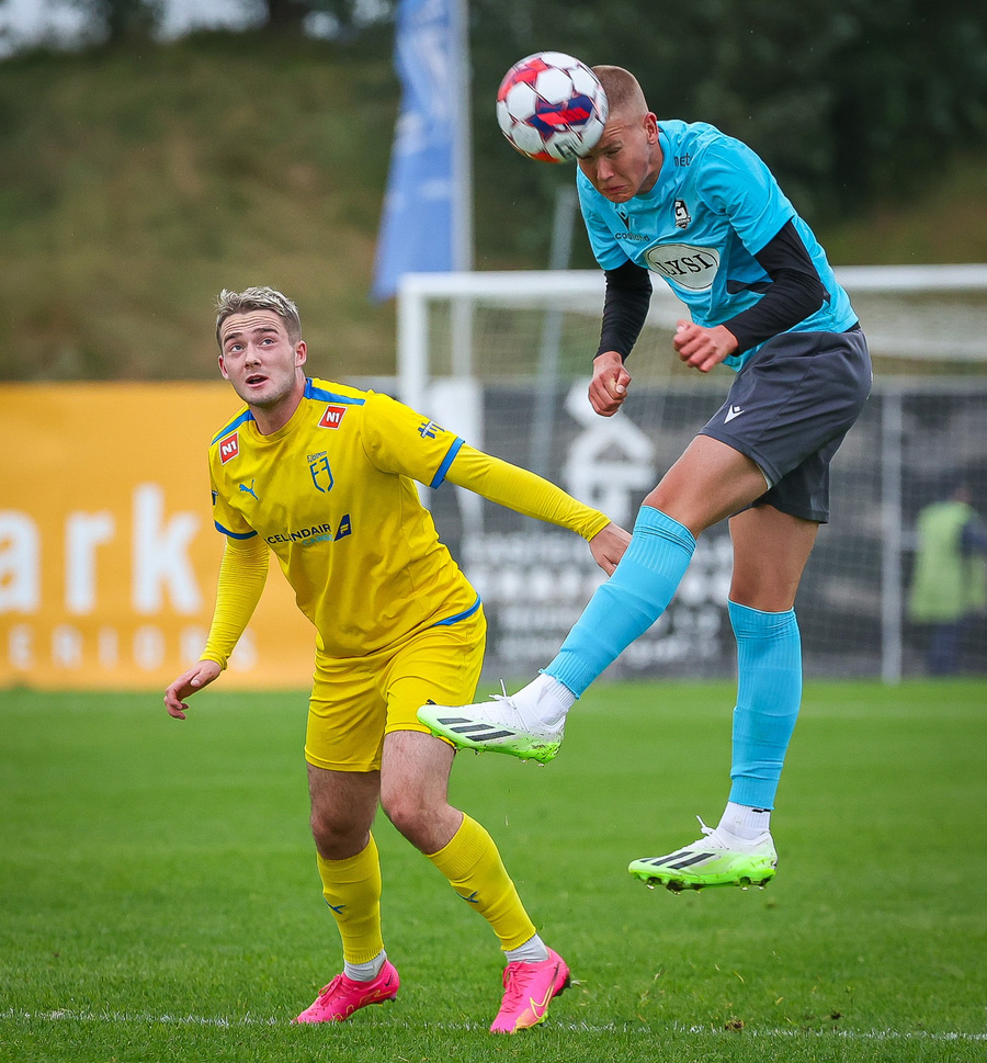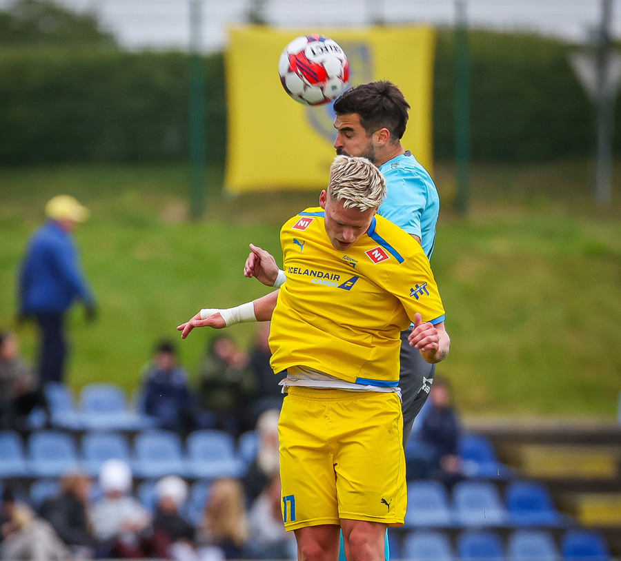 Júlíus með flottan varnarleik, kemst í skallaboltann í baráttunni við Edi Horvat inn á teignum og skallar til hliðar.