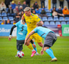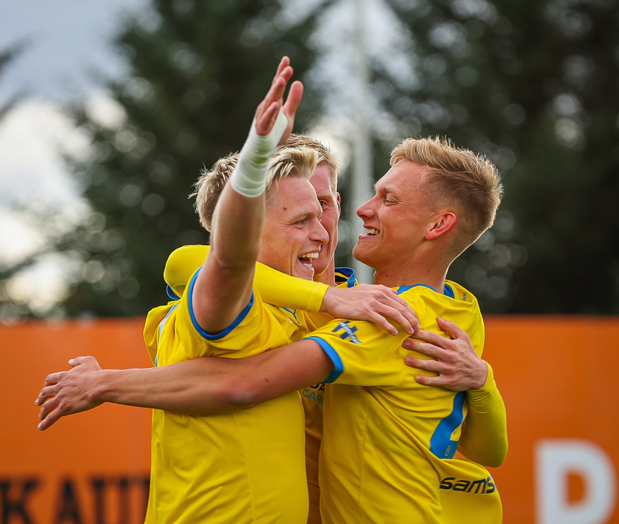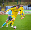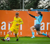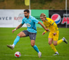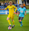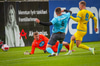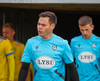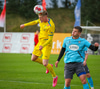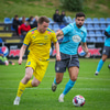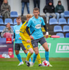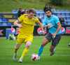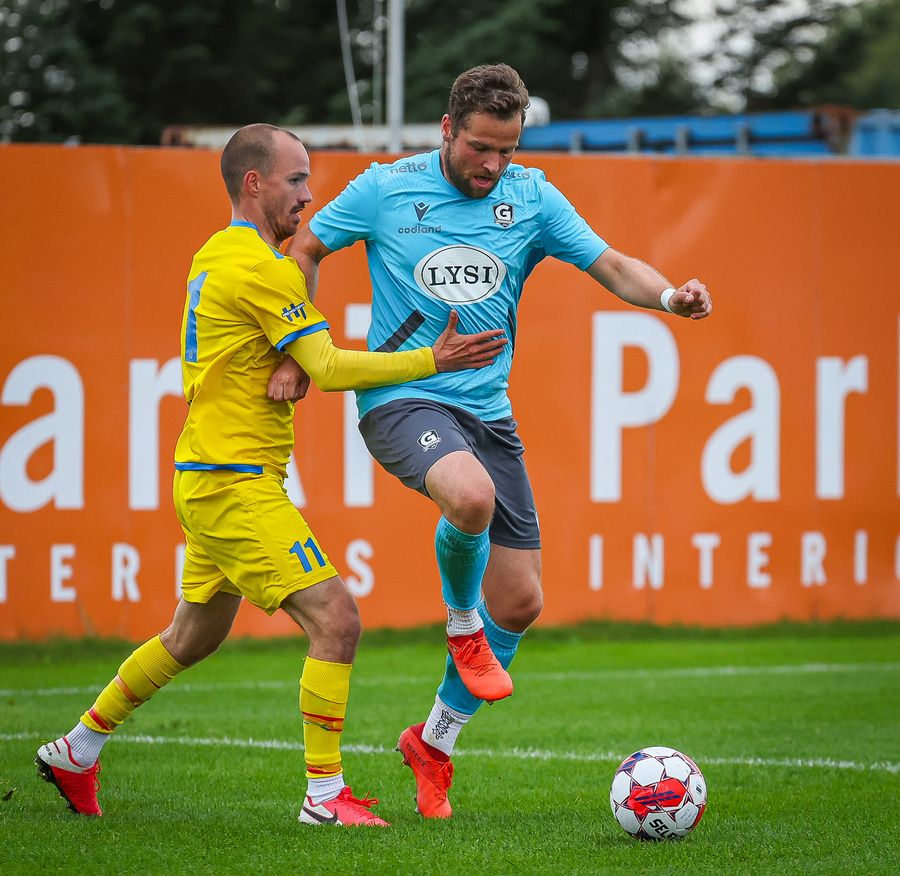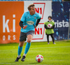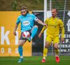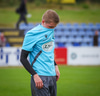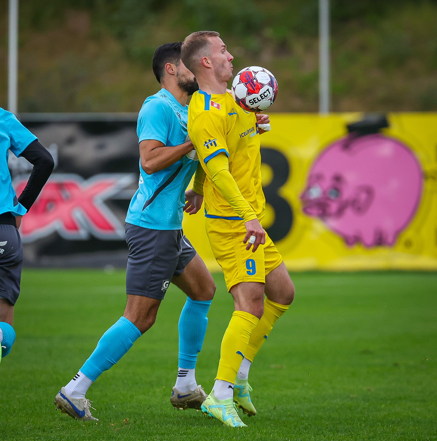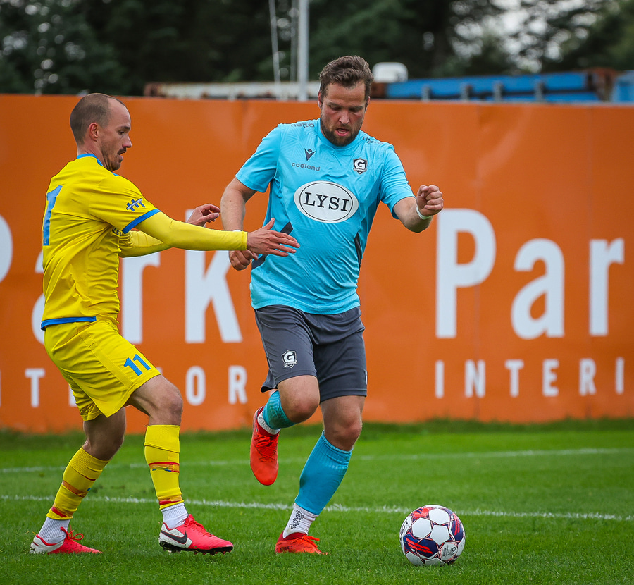 Júlíus með flottan varnarleik, kemst í skallaboltann í baráttunni við Edi Horvat inn á teignum og skallar til hliðar.