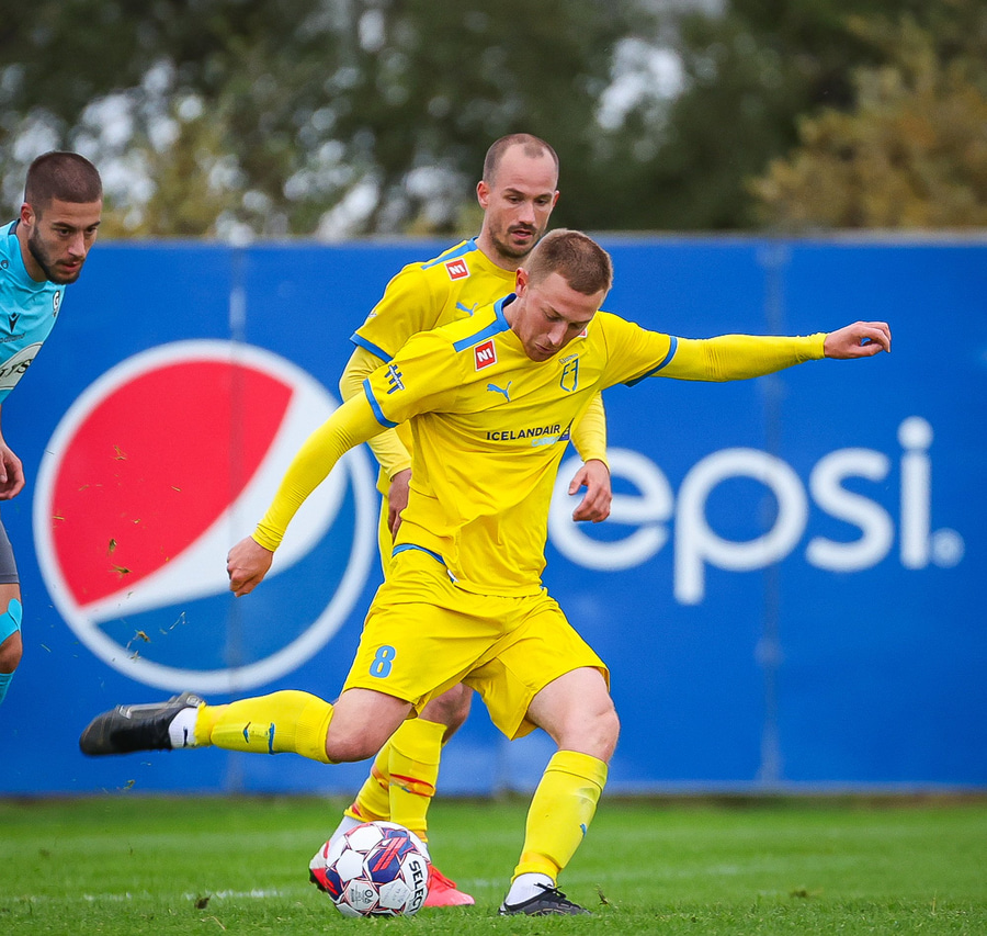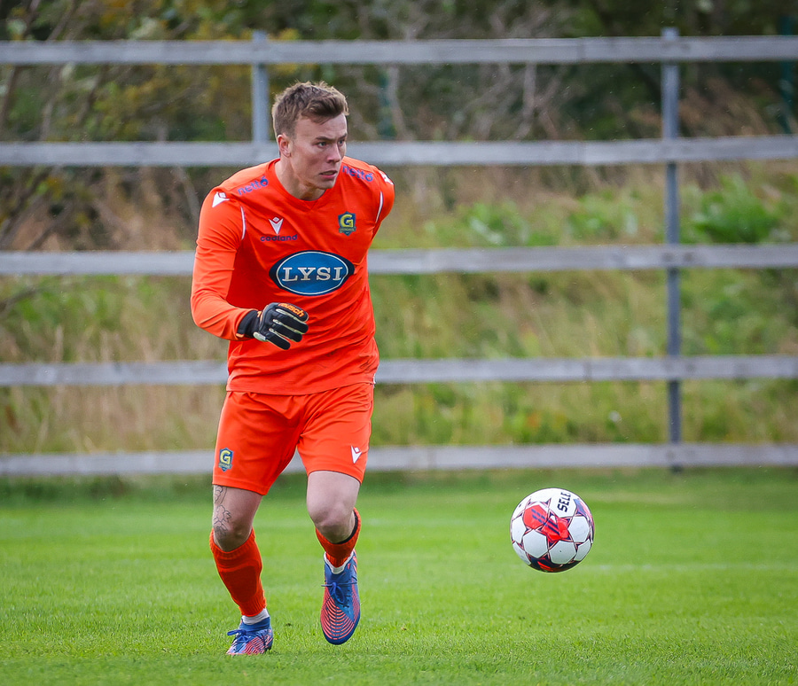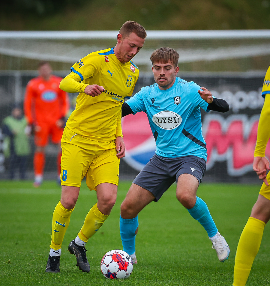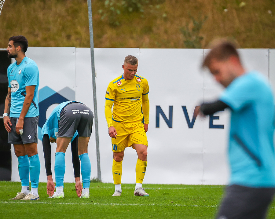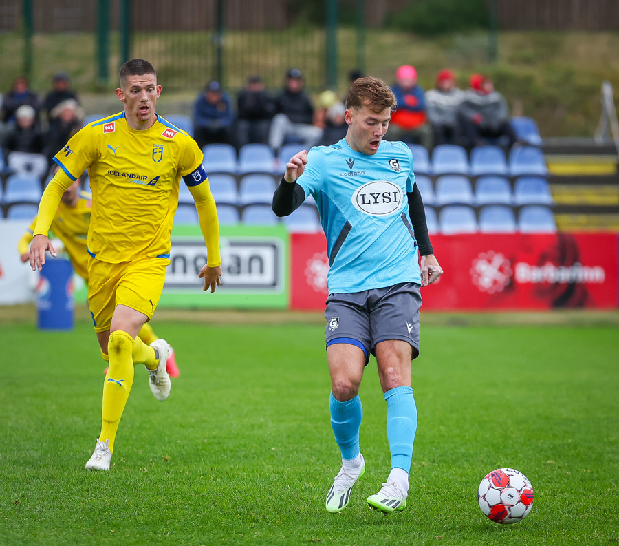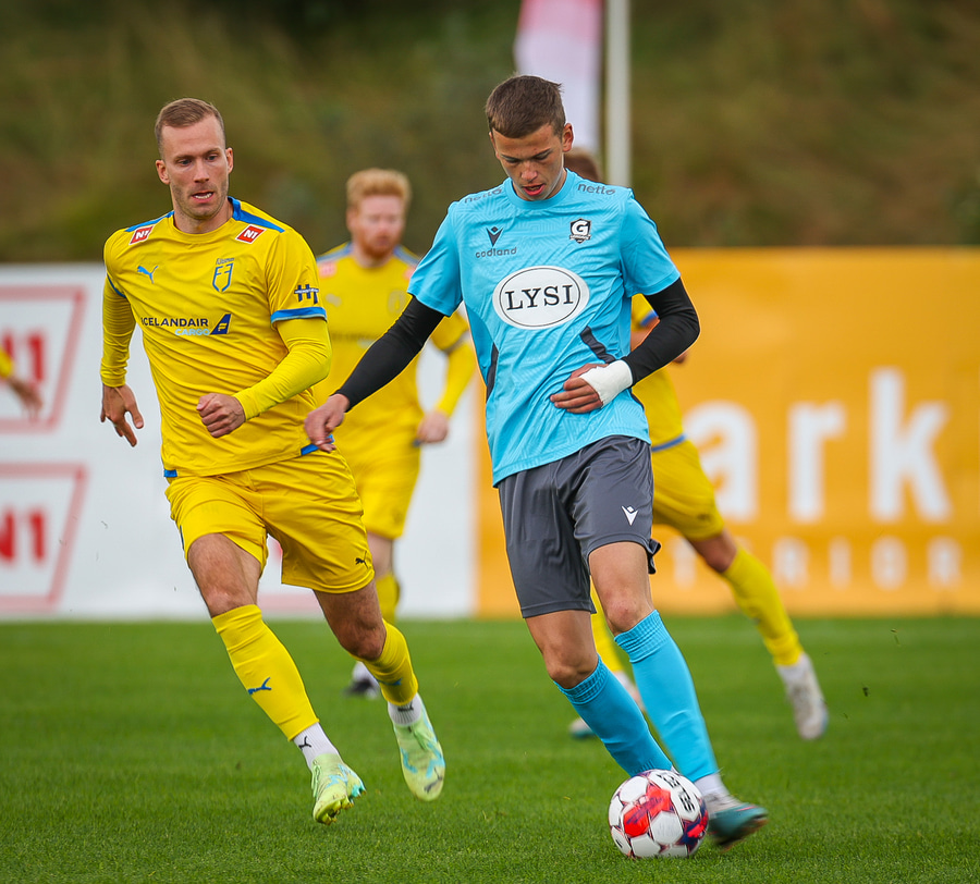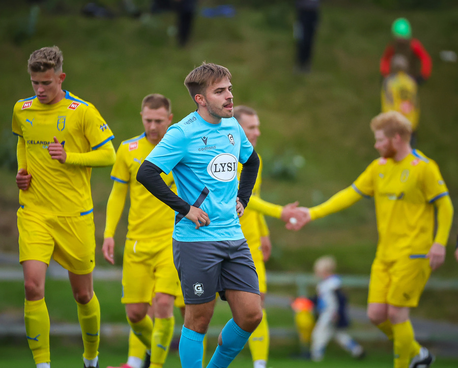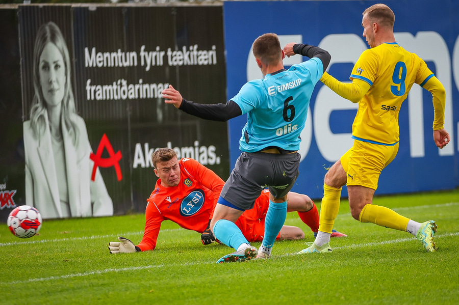 Máni fékk boltann fyrir utan teig frá Degi Inga, lét vaða og Aron Dagur ver. Boltinn fellur hins vegar fallega fyrir Bjarna Gunnarsson sem kom á hlaupinu í frákastið og hann kemur boltanum í netið.