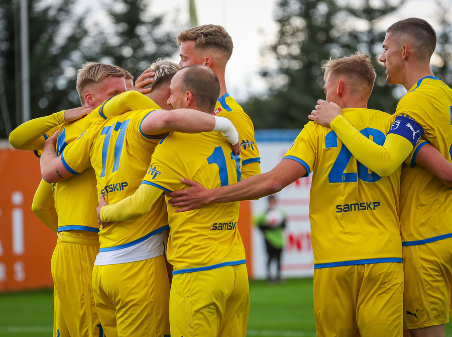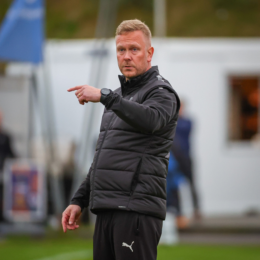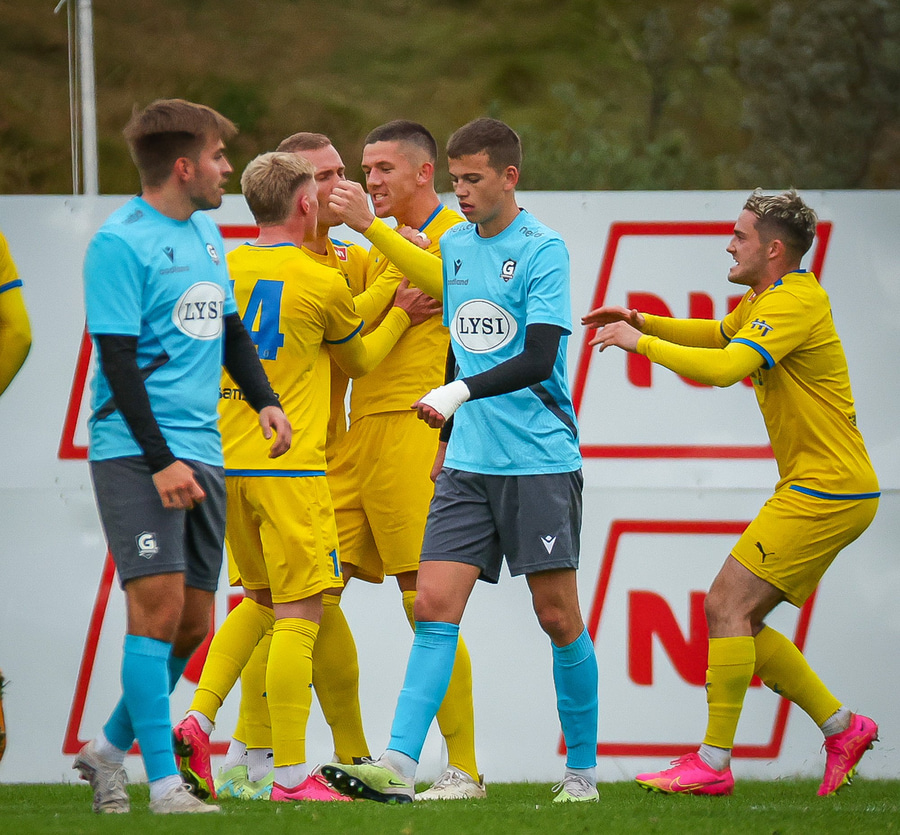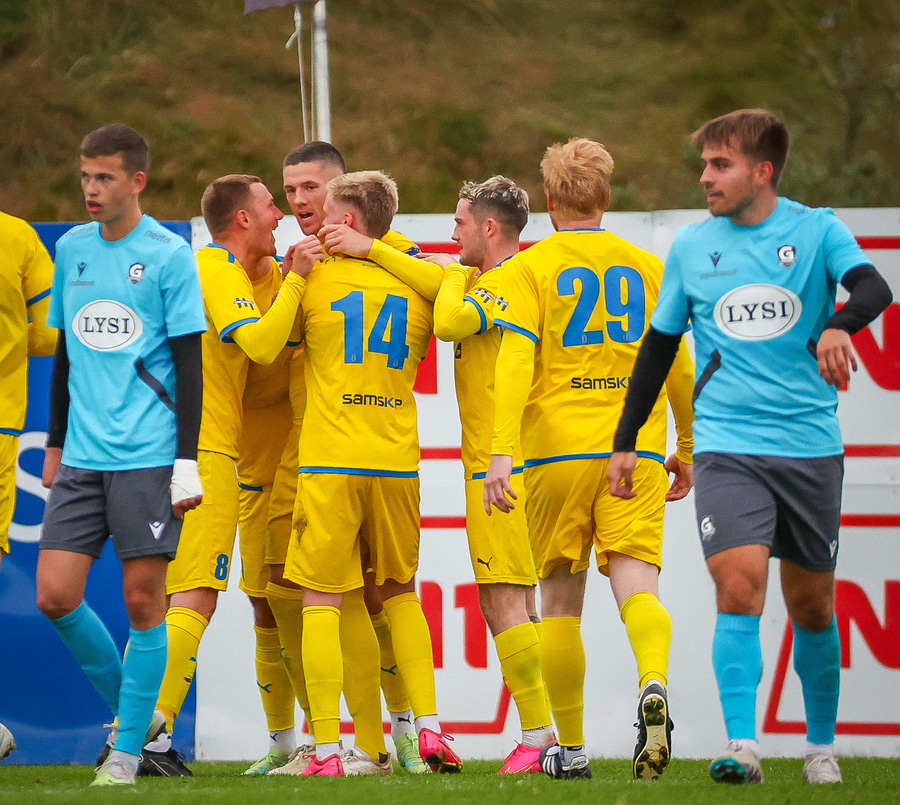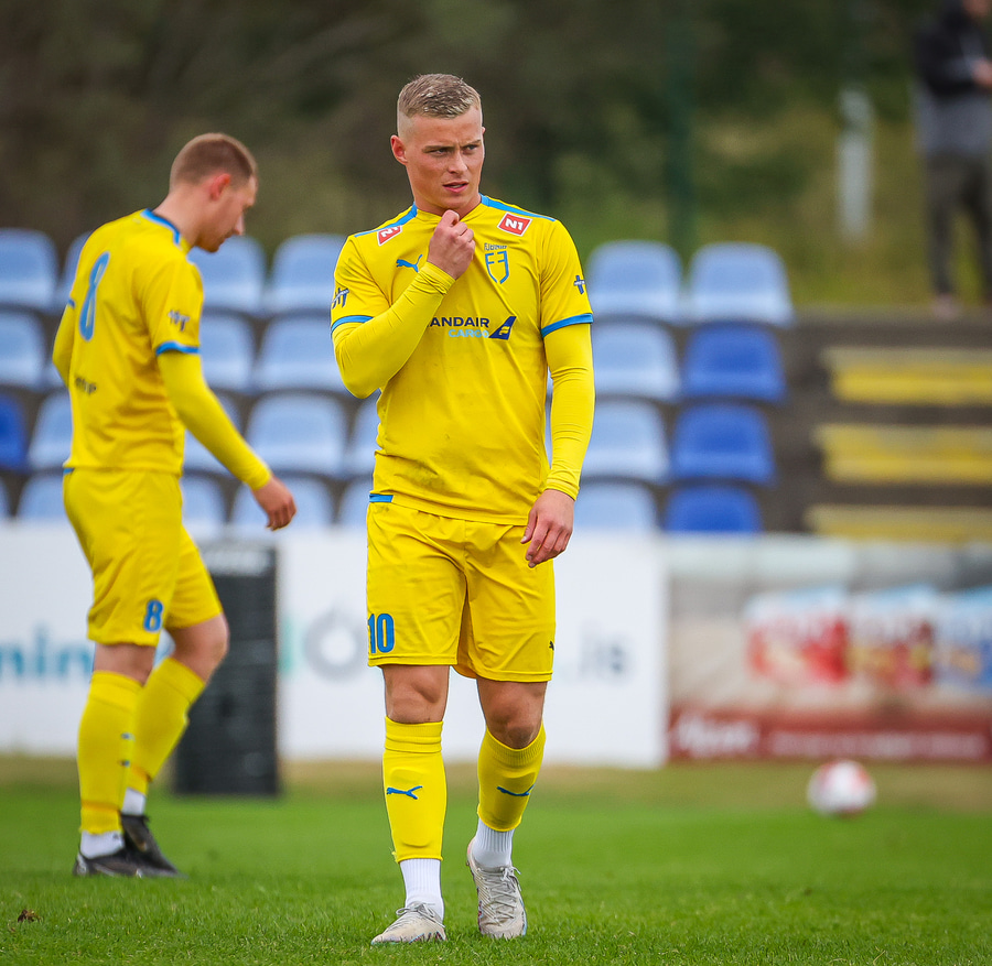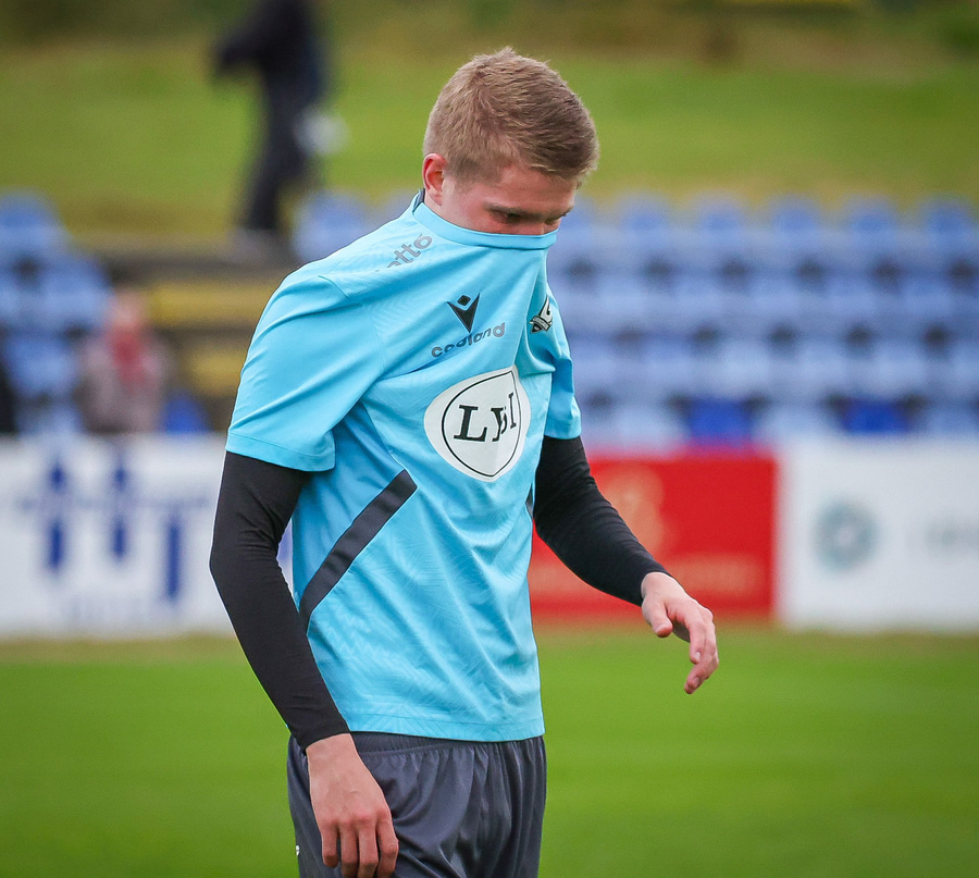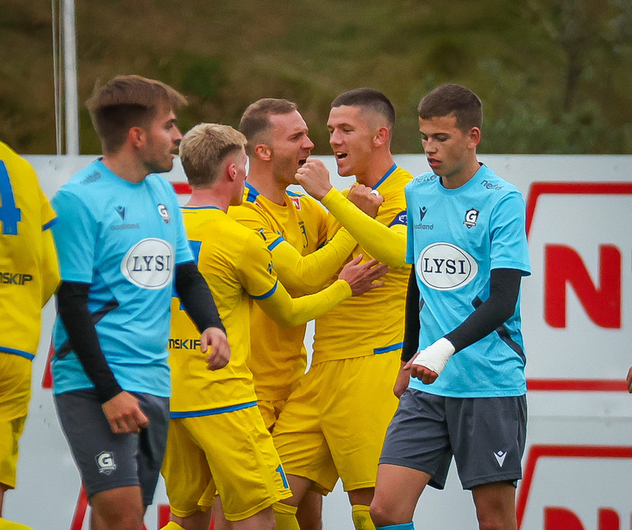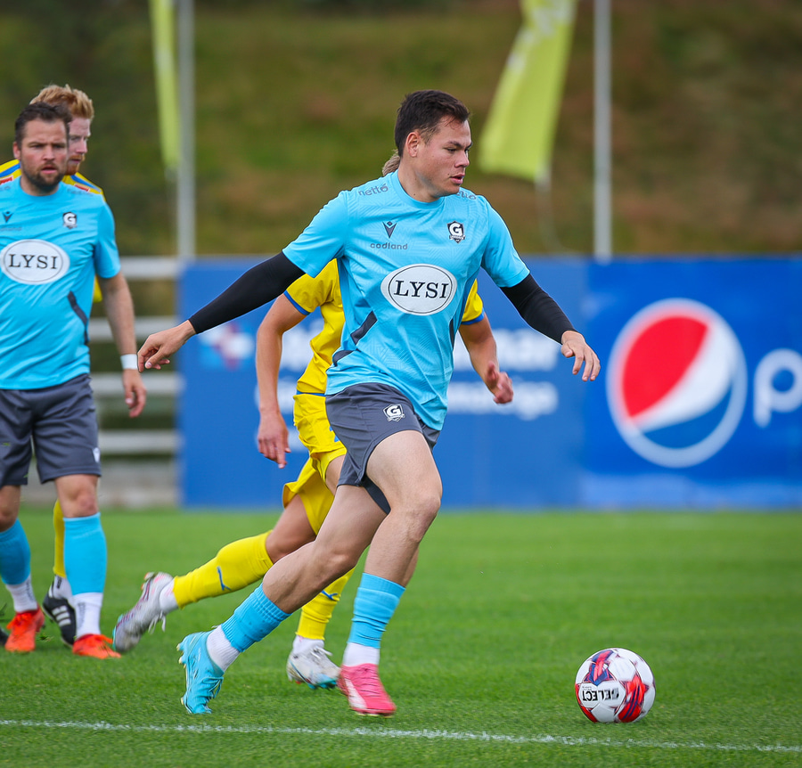 Máni fékk boltann fyrir utan teig frá Degi Inga, lét vaða og Aron Dagur ver. Boltinn fellur hins vegar fallega fyrir Bjarna Gunnarsson sem kom á hlaupinu í frákastið og hann kemur boltanum í netið.
