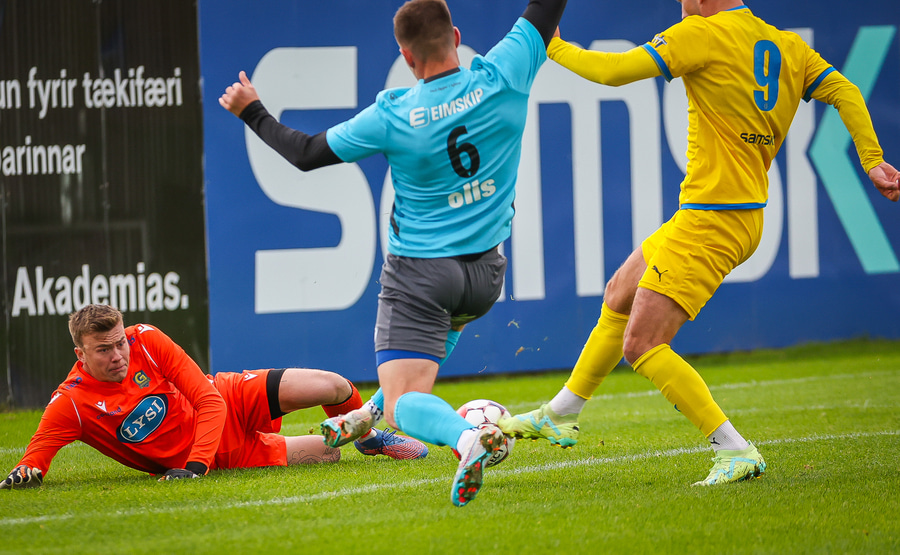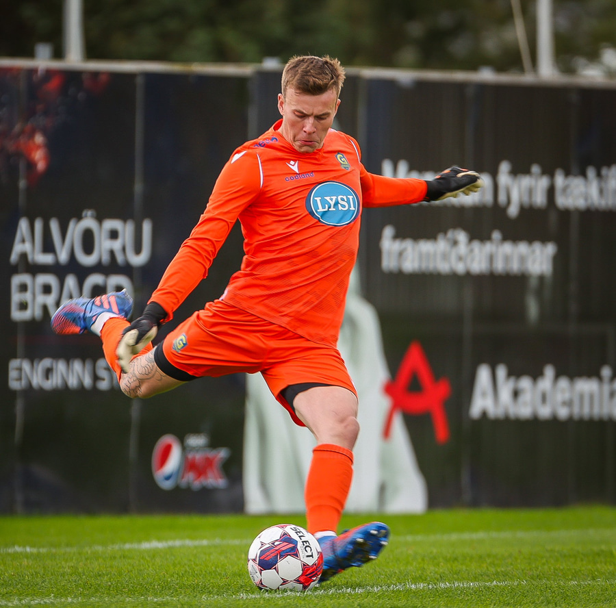 Sigurjón gerir vel að slá boltann yfir markið, flottur bolti frá hægri hjá Grindavik.