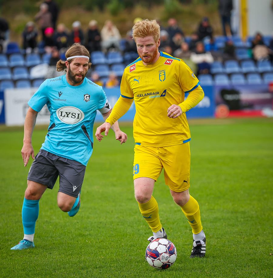 Máni hársbreidd frá því að komast í boltann inn á vítateig Grindavíkur. Aron Dagur rétt á undan honum.
