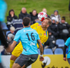Fyrirgjöf frá hægri sem Máni kemst í en skalli hans fer af Tómasi Orra og þaðan til Arons í markinu.