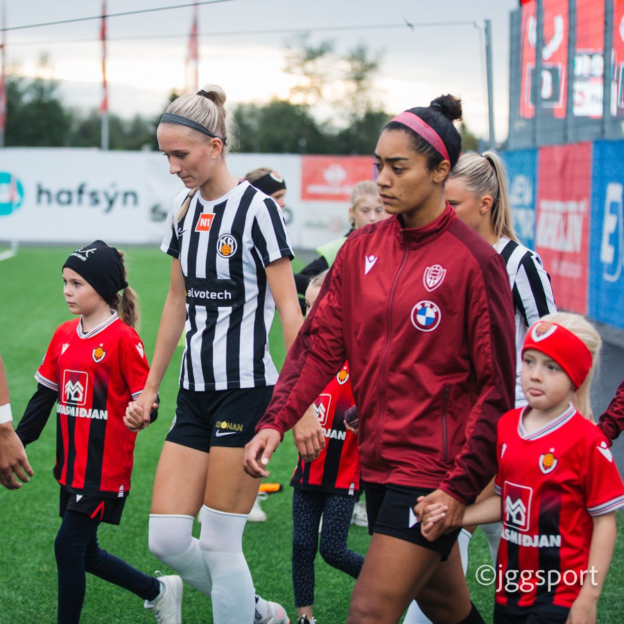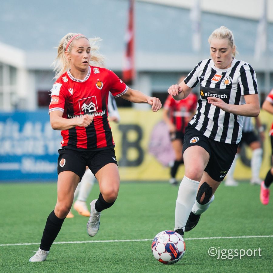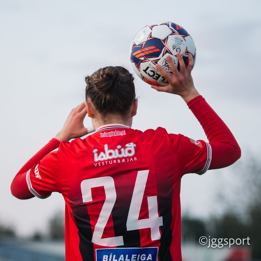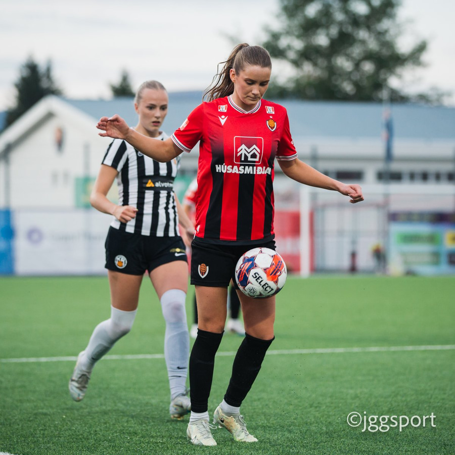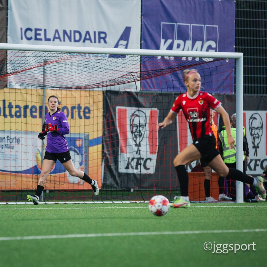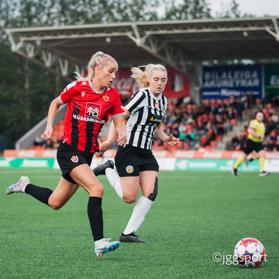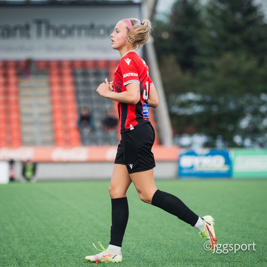 Jewel Boland á harðaspretti upp vinstri kantinn. Hún nær skotinu en það er beint á Sigurborg í markinu.