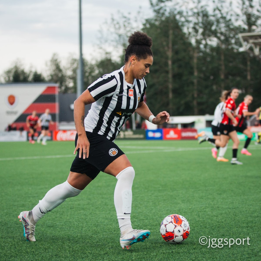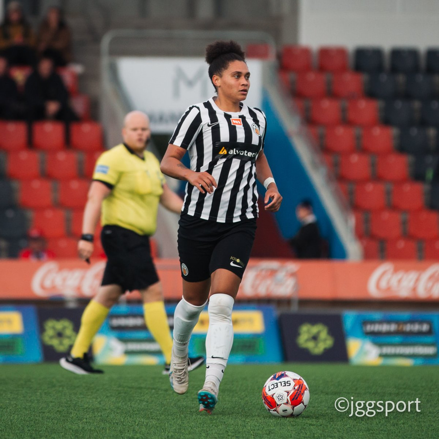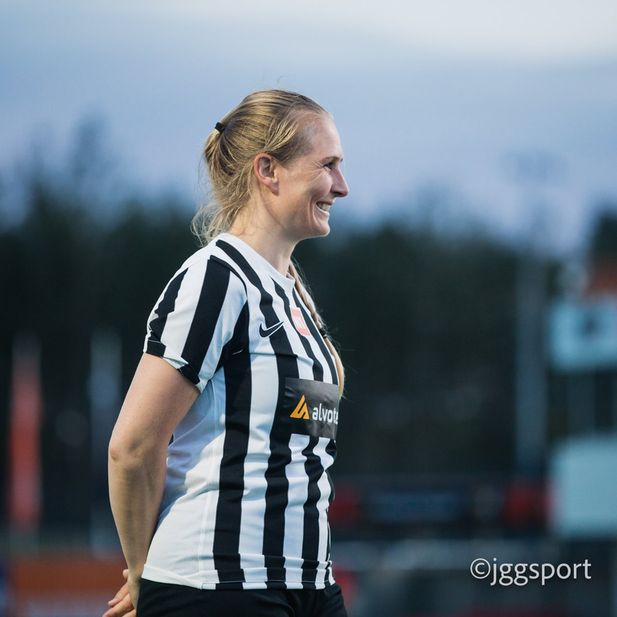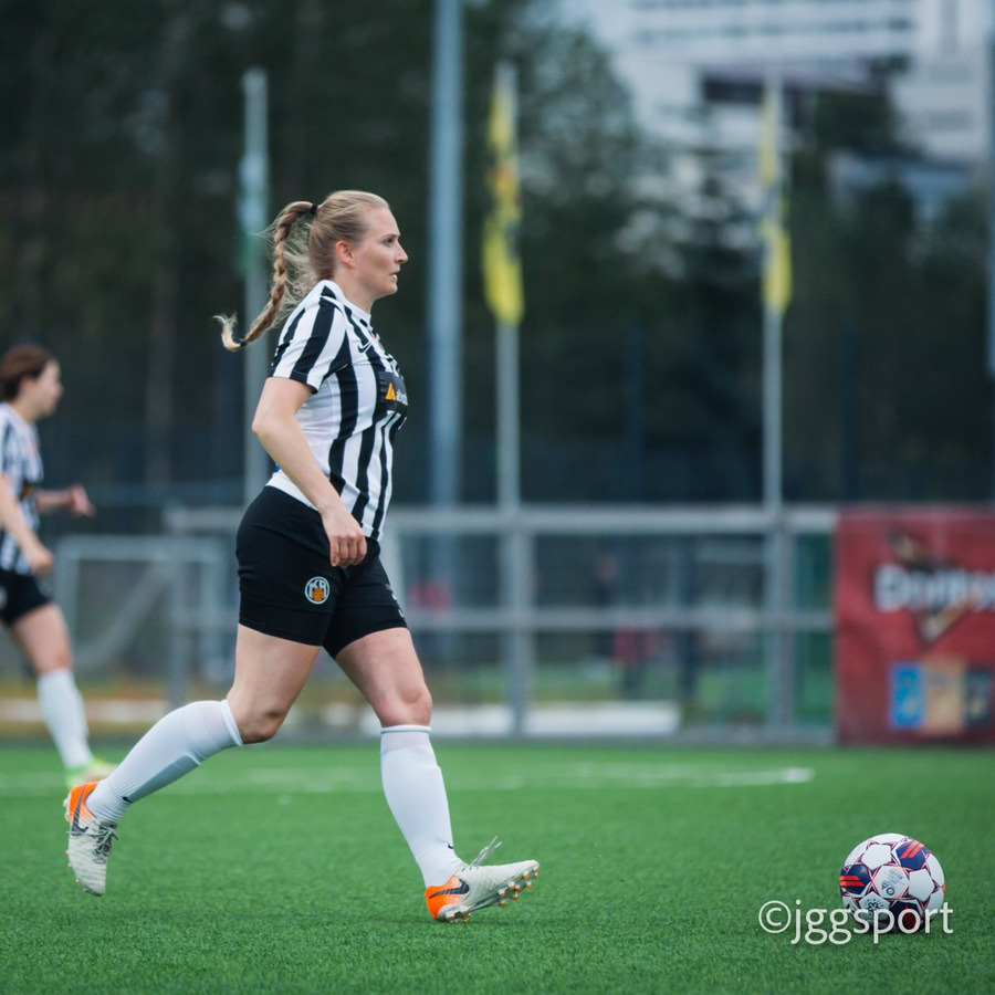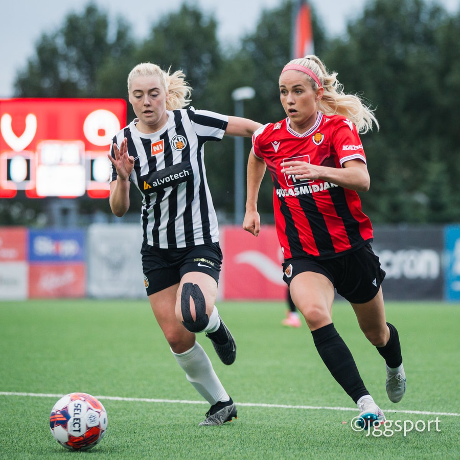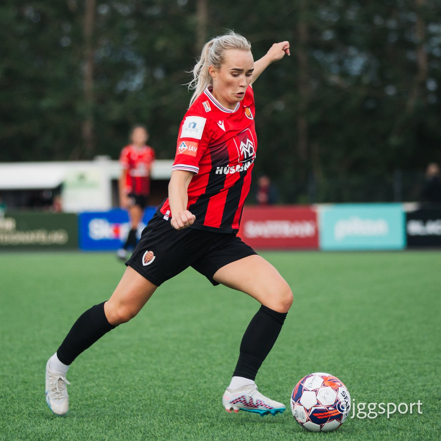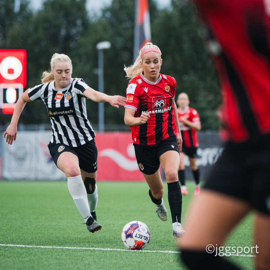 Jewel Boland á harðaspretti upp vinstri kantinn. Hún nær skotinu en það er beint á Sigurborg í markinu.