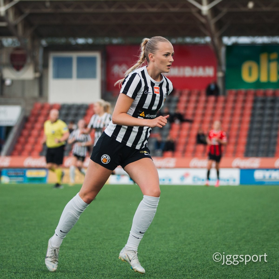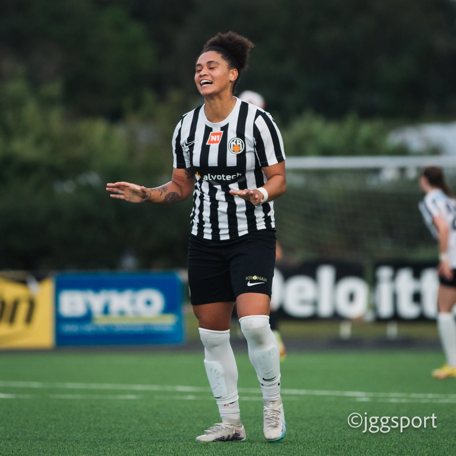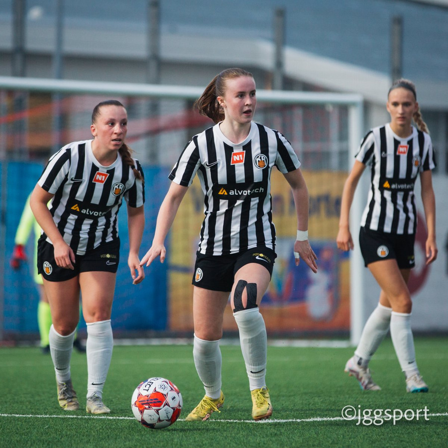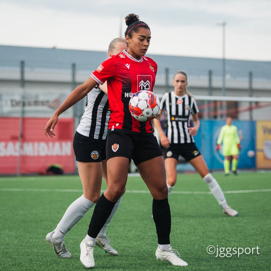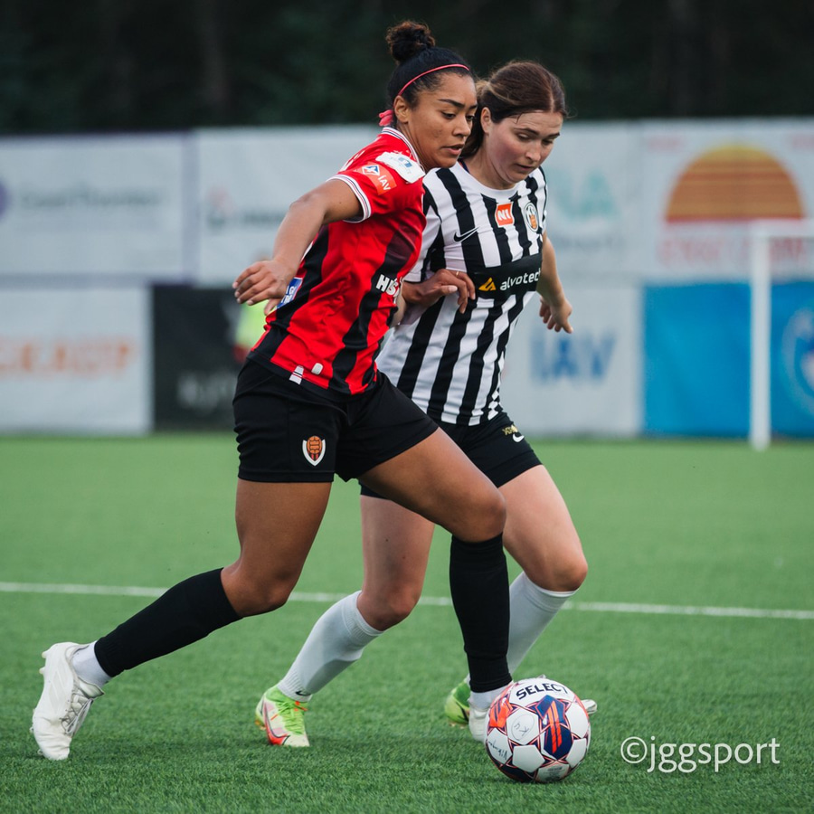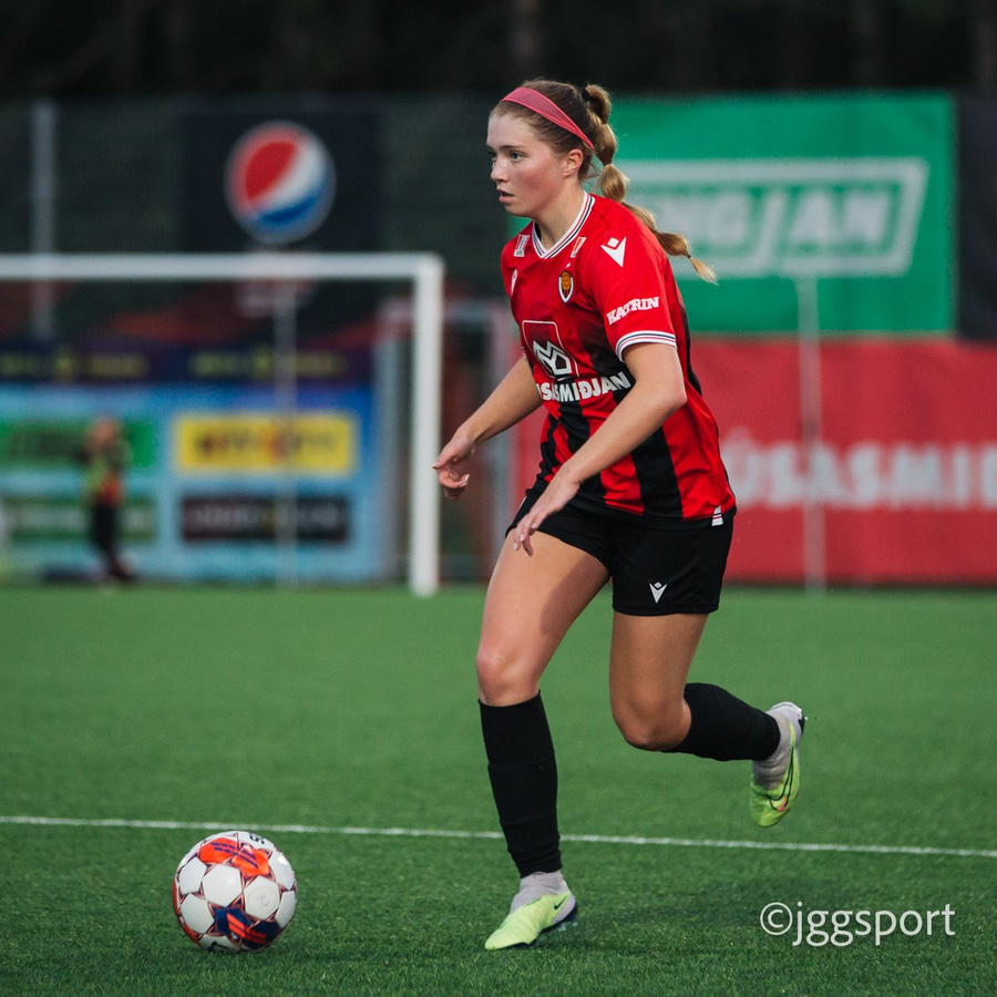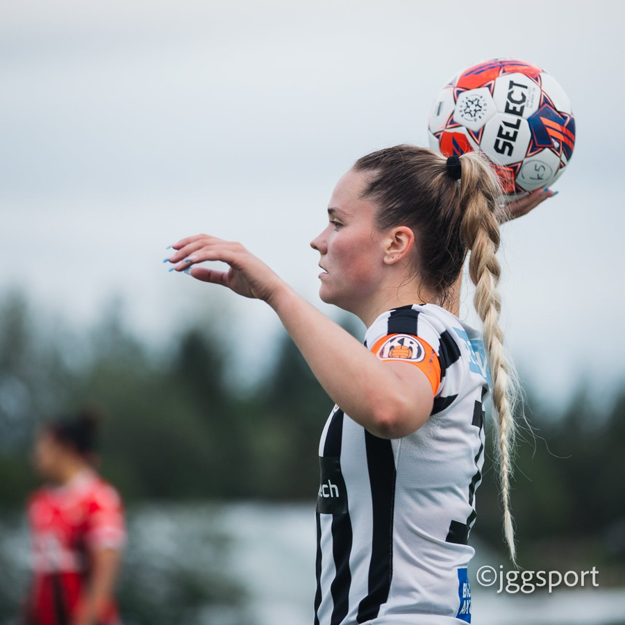 Jewel Boland á harðaspretti upp vinstri kantinn. Hún nær skotinu en það er beint á Sigurborg í markinu.