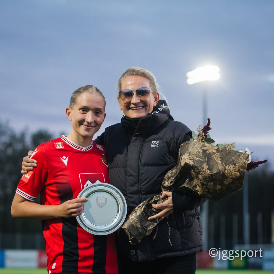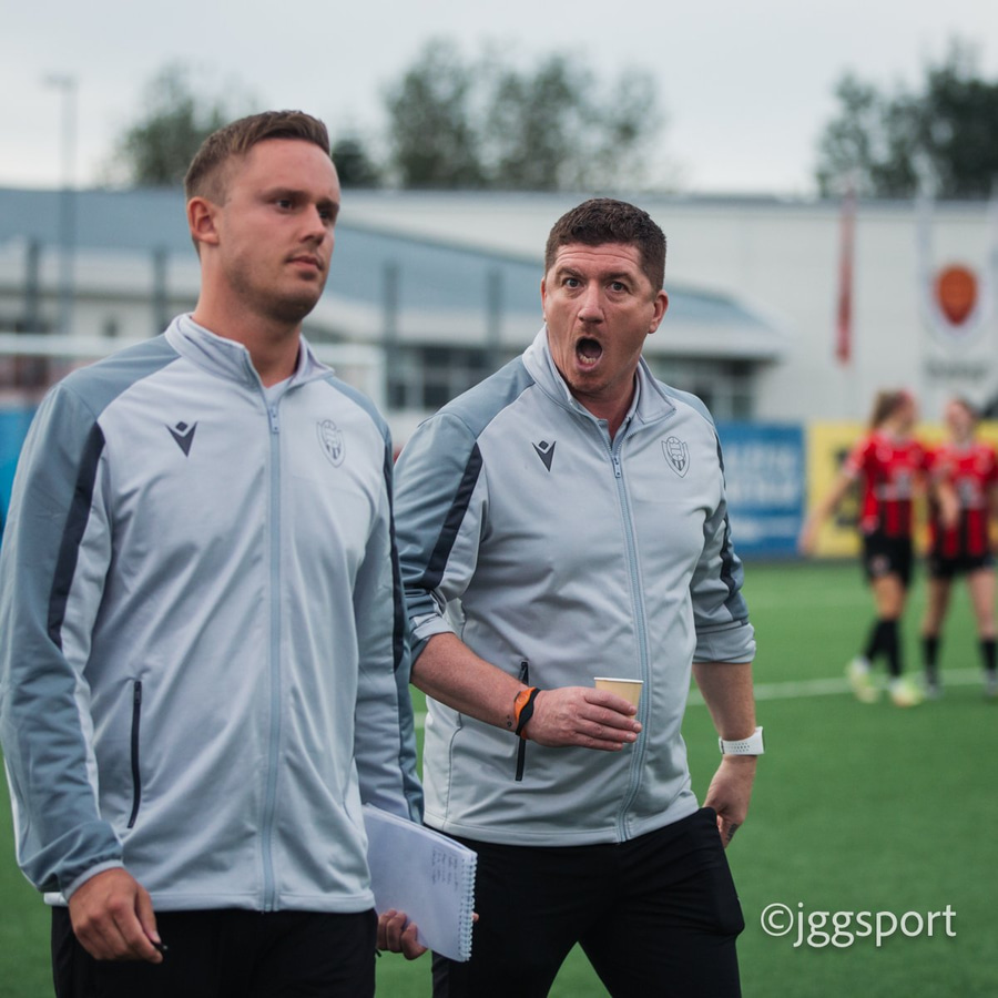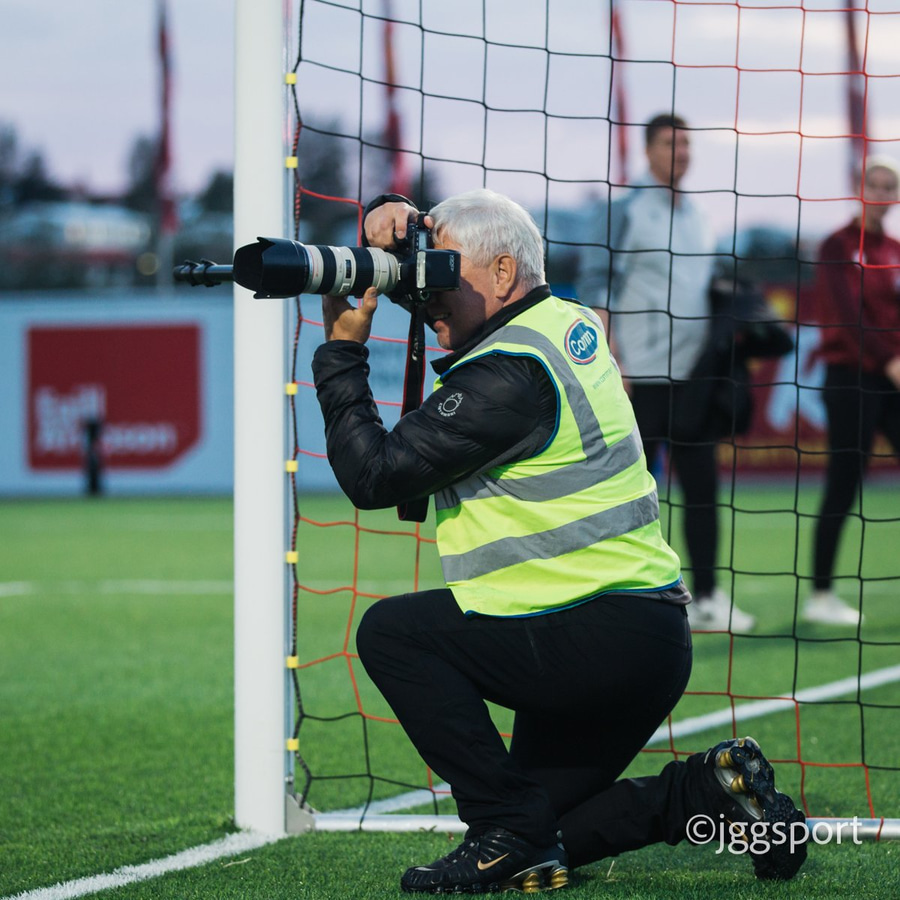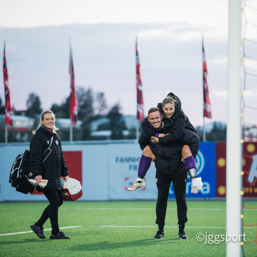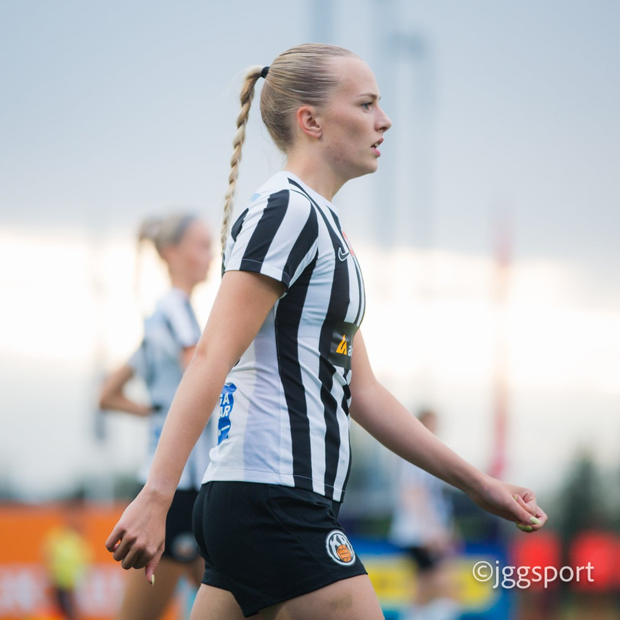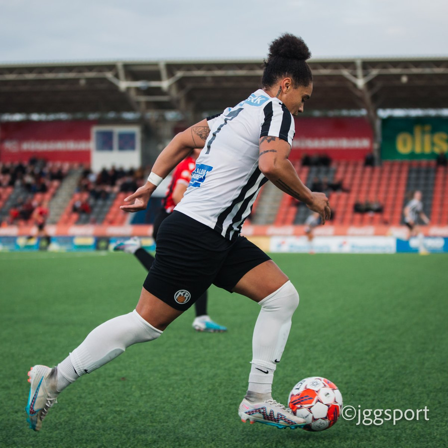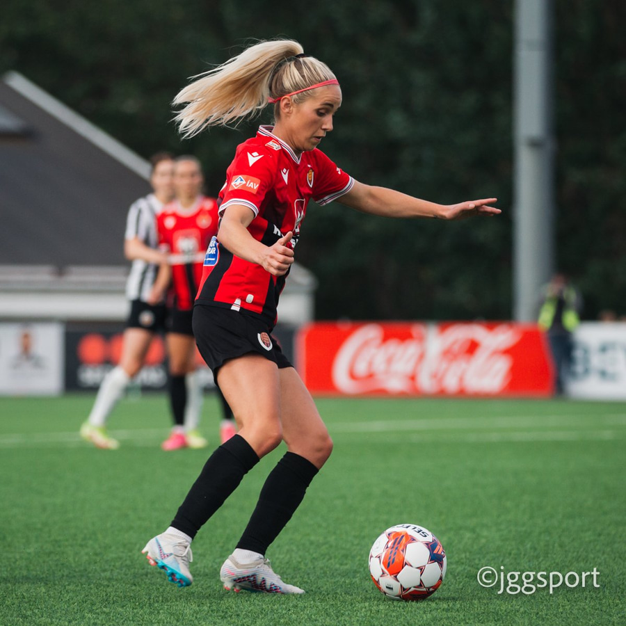 Jewel Boland á harðaspretti upp vinstri kantinn. Hún nær skotinu en það er beint á Sigurborg í markinu.