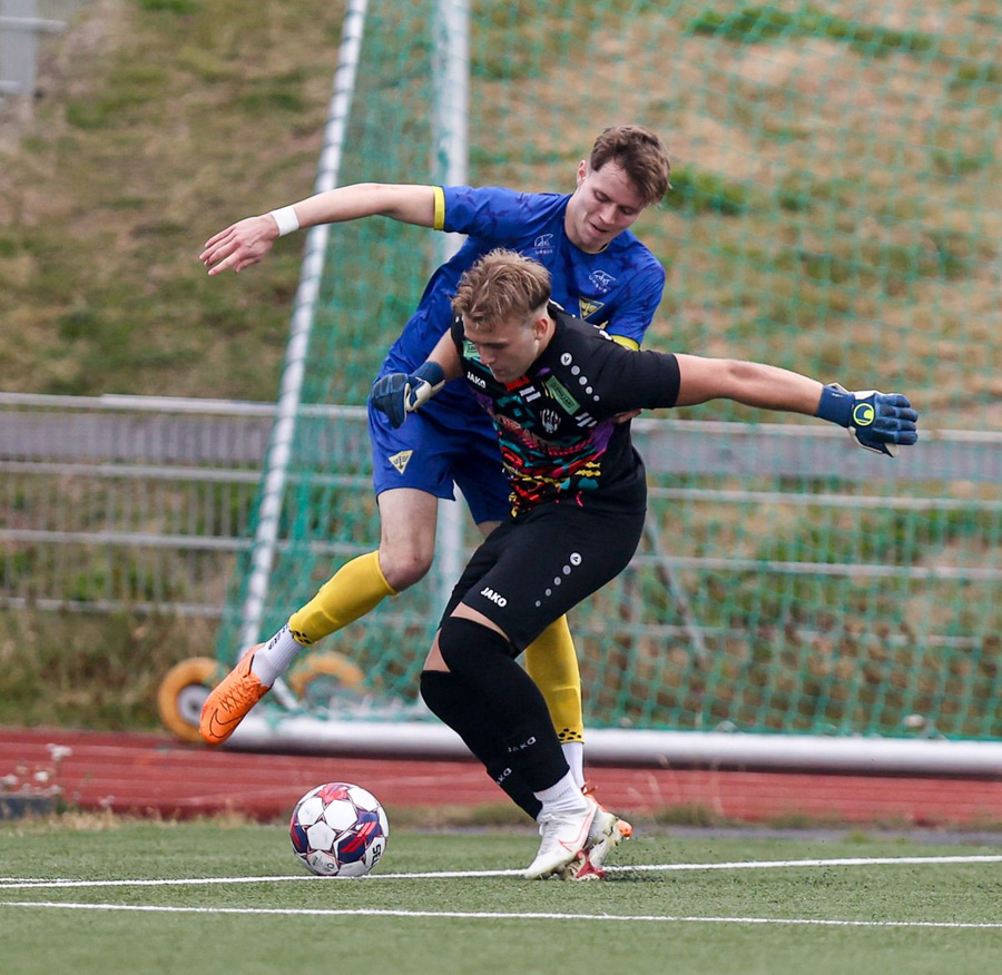 HIlmar óákveðinn og lengi að losa sig við boltann. Arnar Númi setur pressu á hann og er hársbreidd frá því að ná að pota í boltann og setja hann inn en Hilmar rétt nær að bjarga þessu og sleppur með skrekkinn.