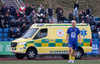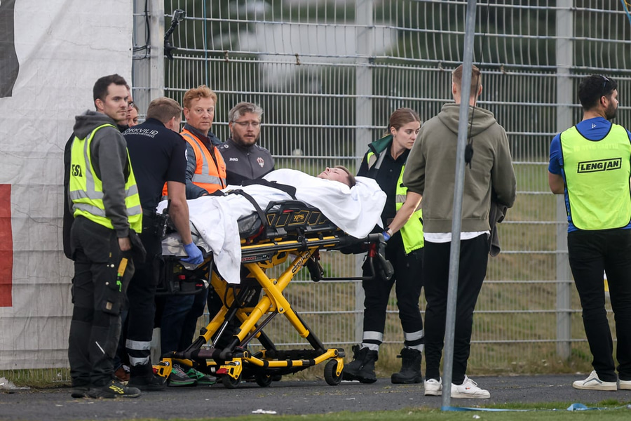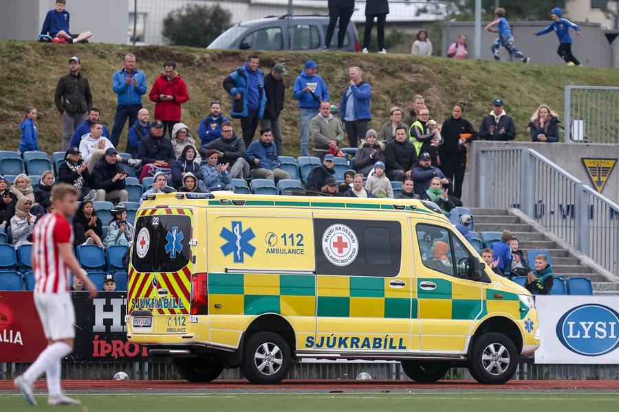 Sveinn Óli stekkur út til að kýla boltann burt og lendir illa á Arnari Þór. Hann liggur eftir og þarf aðhlynningu.