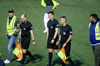 Einhver hiti á leiðinni inn í klefa. Sá ekki betur en að gult spjald færi á loft en ekki hugmynd á hvern það var.