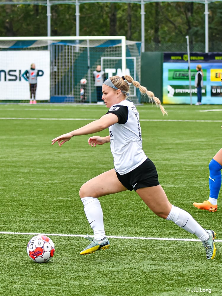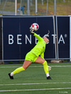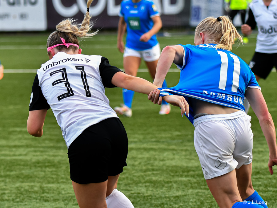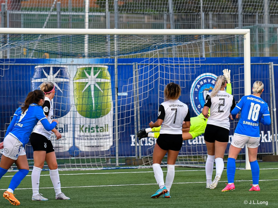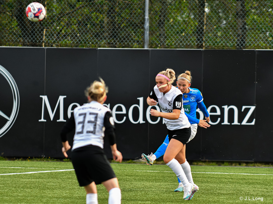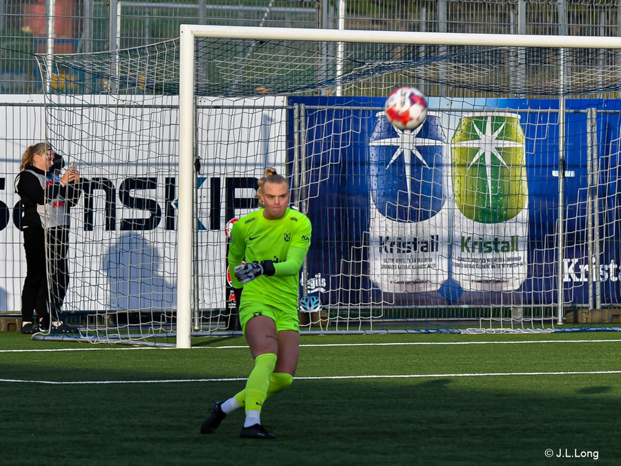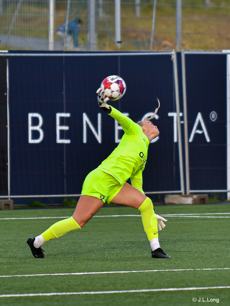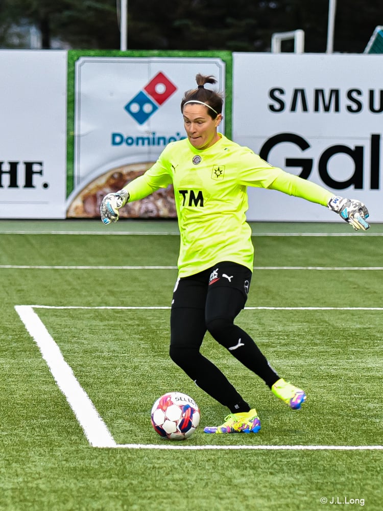 Colleen reynir skotið fyrir gestina af talsverðu færi en beint í fang Erin í markinu.