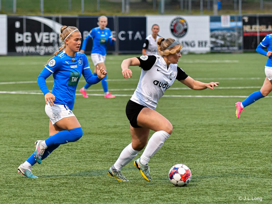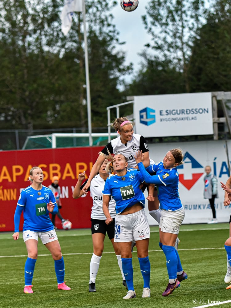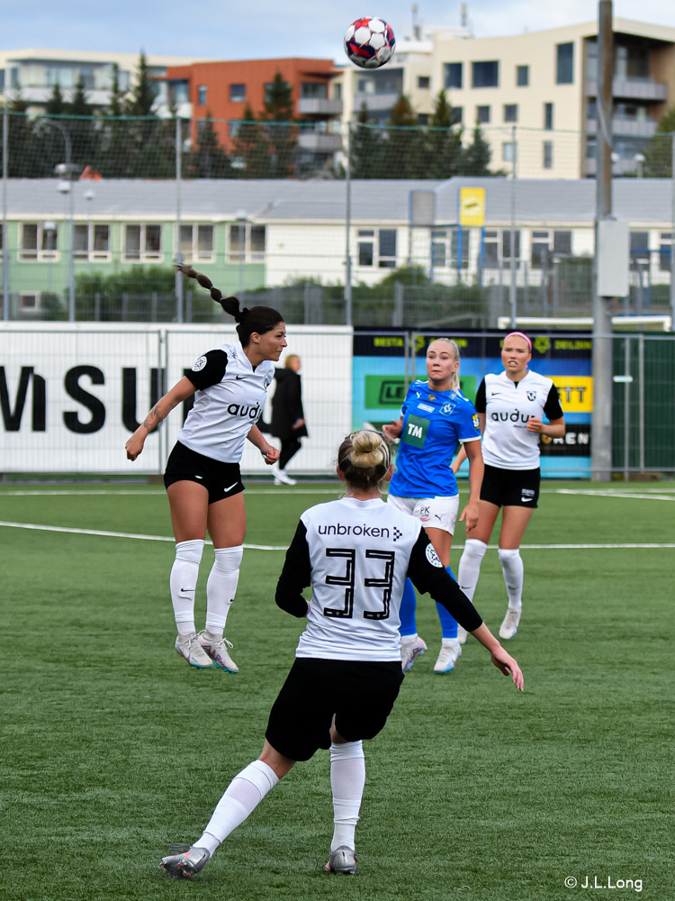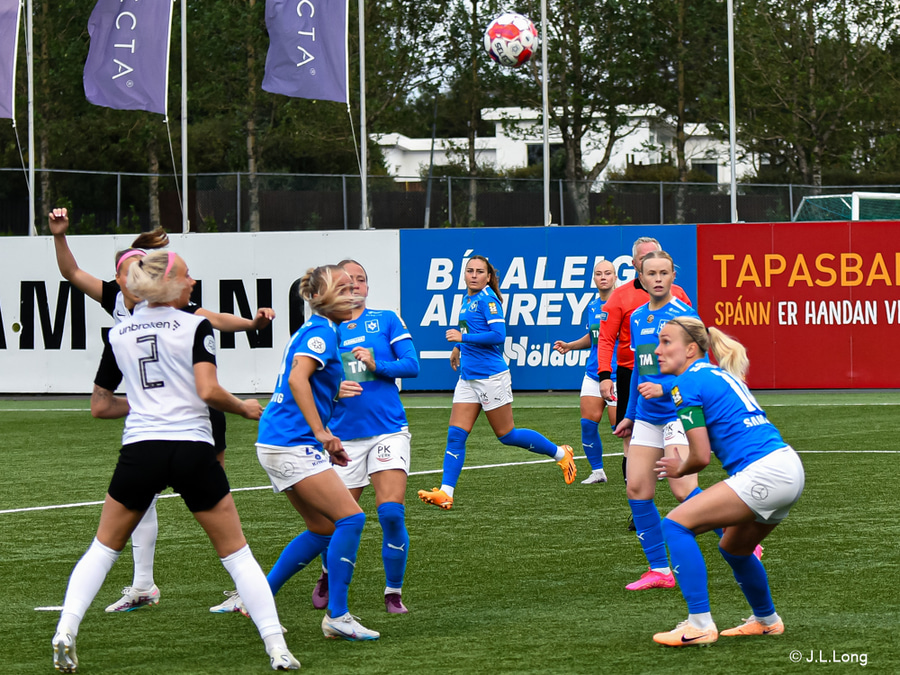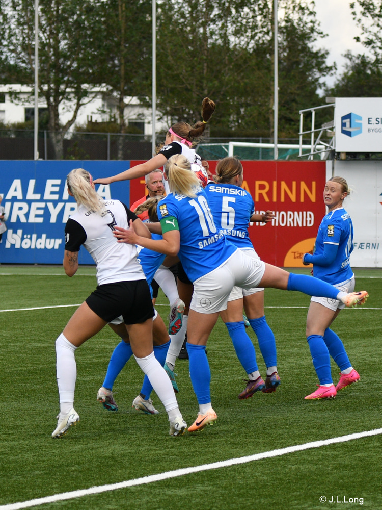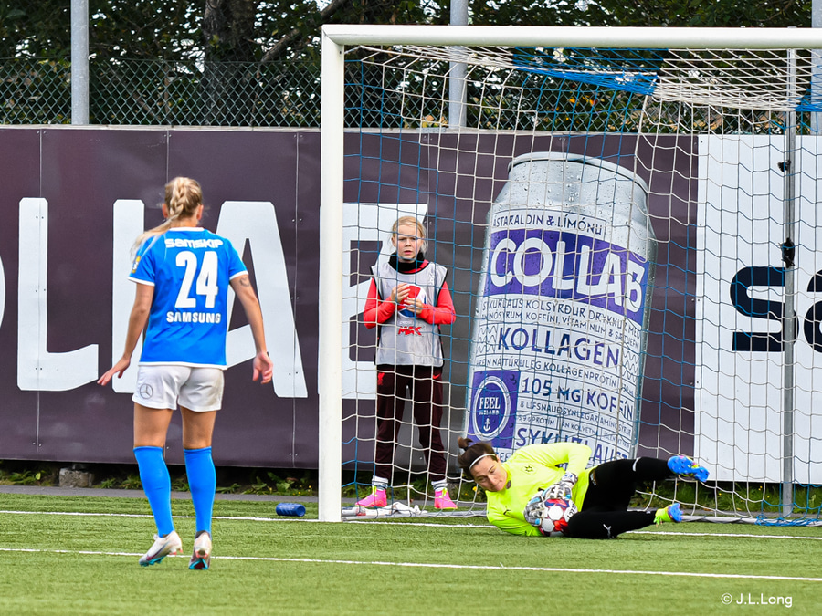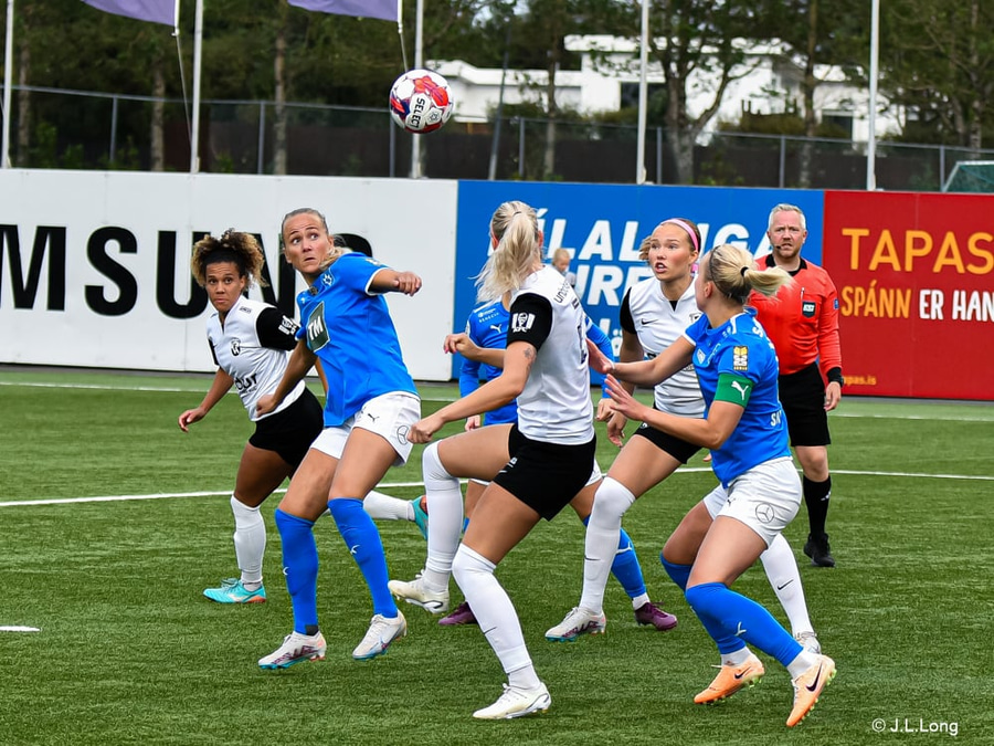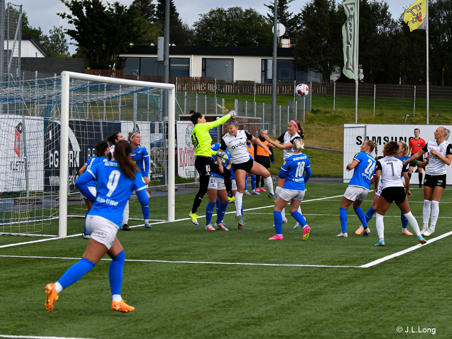Málfríður Erna skóflar boltanum yfir af stuttu færi eftir hornspyrnu.