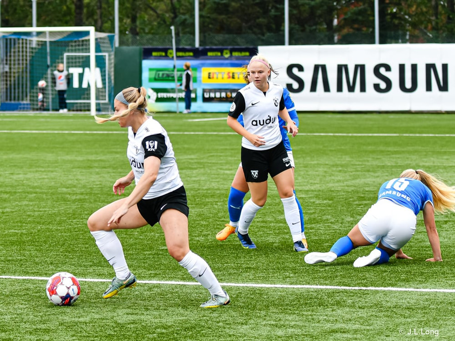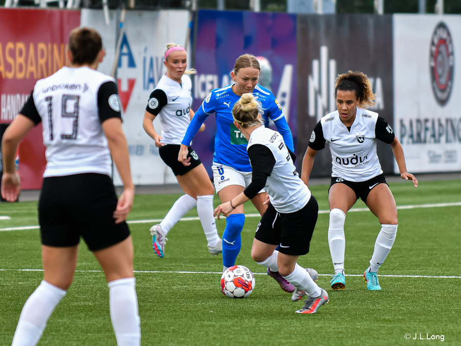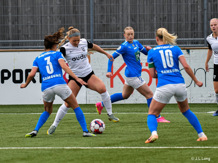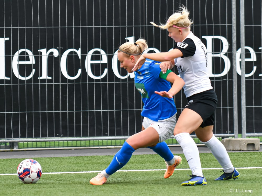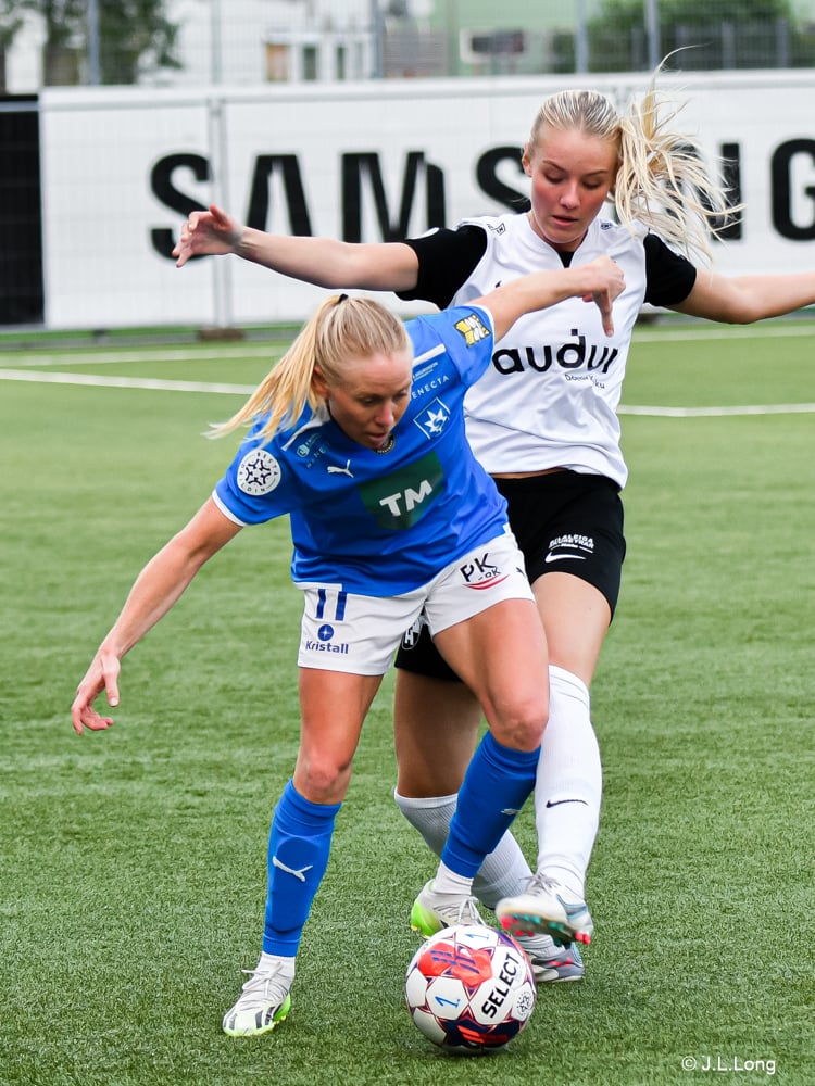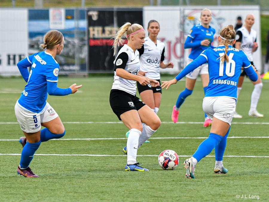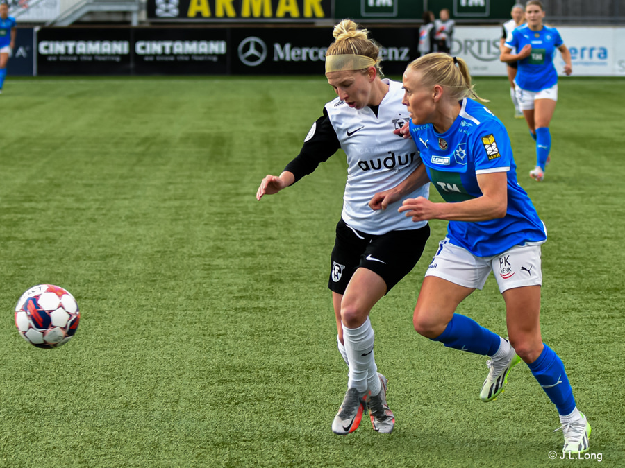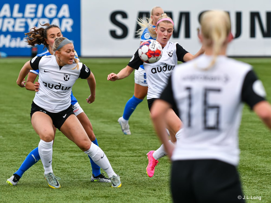 Málfríður Erna skóflar boltanum yfir af stuttu færi eftir hornspyrnu.