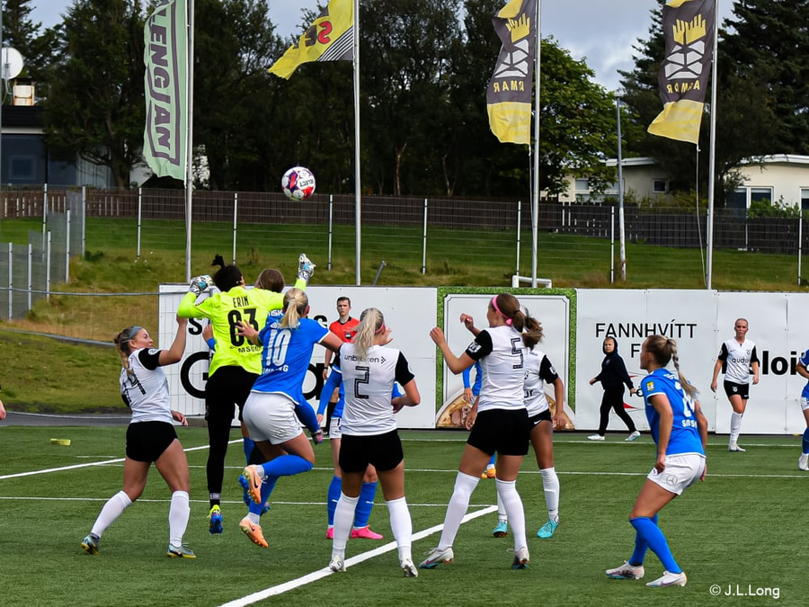 Margrét Brynja með alvöru neglu frá vinstra vítateigshorni sem stefnir efst í hornið nær.  Erin vel á verði og slær boltann glæsilega yfir slánna.