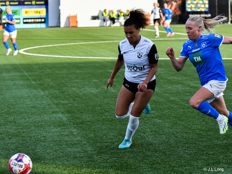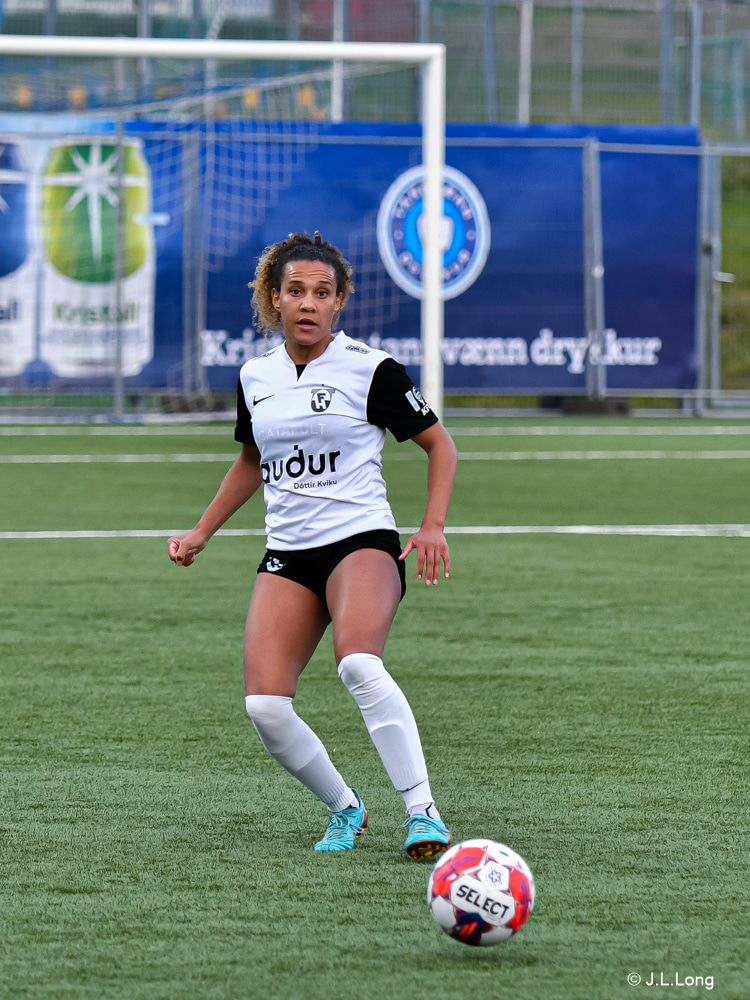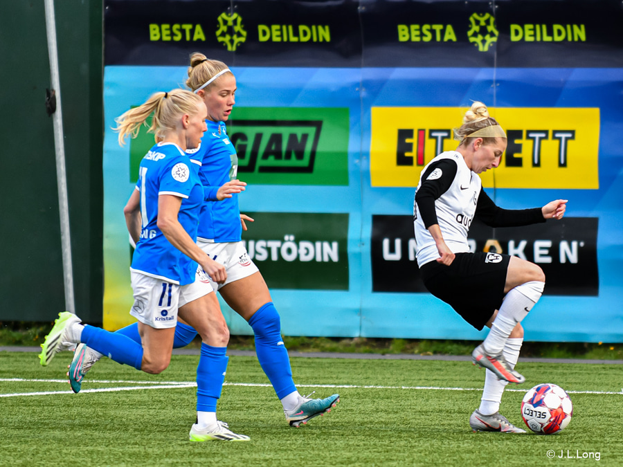 Mackenzie með boltann úti til hægri. Leikur upp að endamörkum og nær fínni fyrirgjöf beint á kollinn á Margréti sem skilar boltanum í netið.