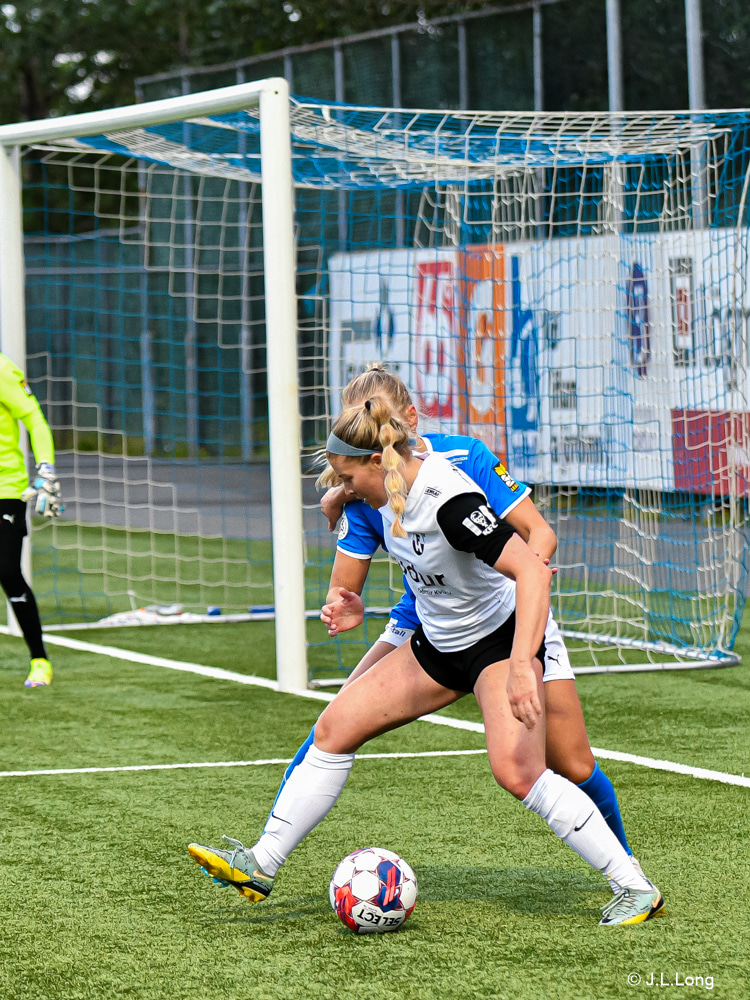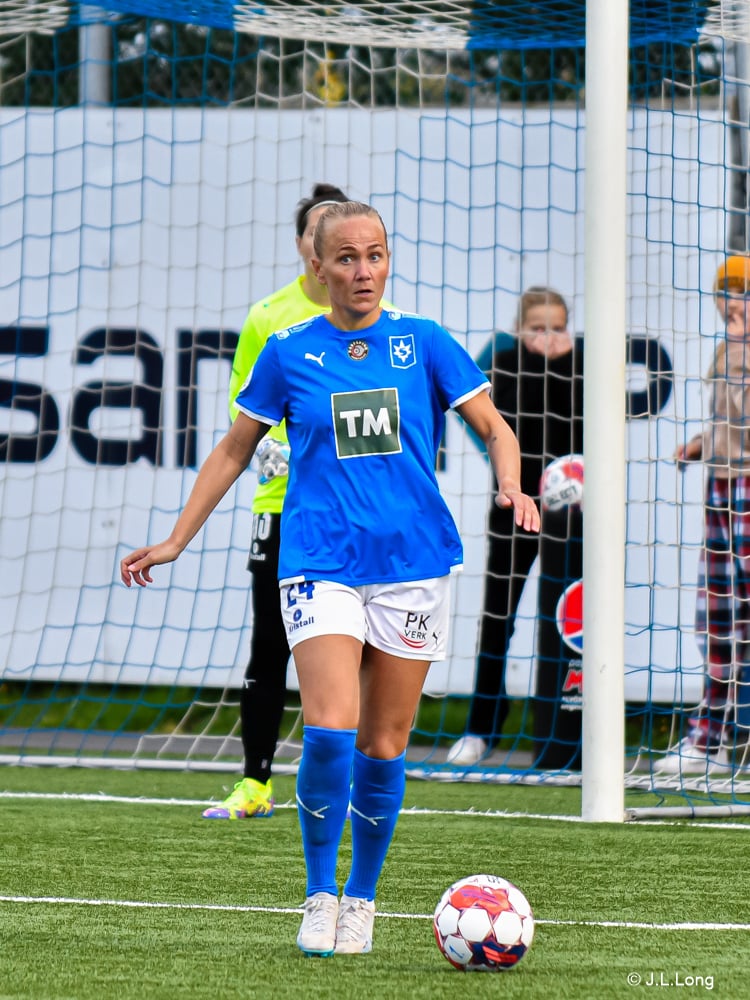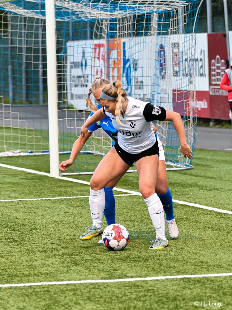 Fær boltann í sig í markteignum undir pressu eftir fyrirgjöf frá hægri frá Thelmu Karen, Slysalegt mark en lítið sem hún gat svo sem gert.