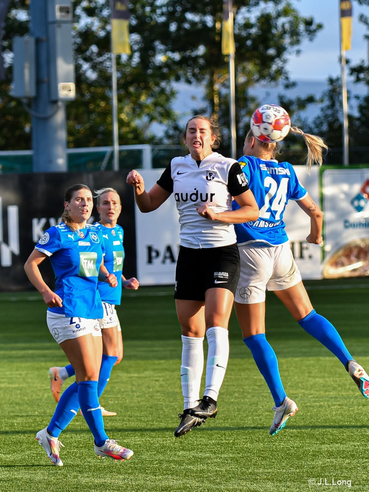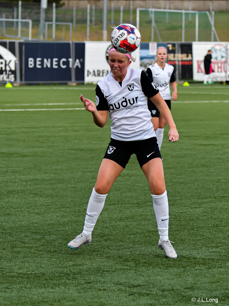 Spyrnan fyrir markið góð en skalli Örnu Eiríks hittir ekki markið.