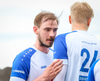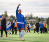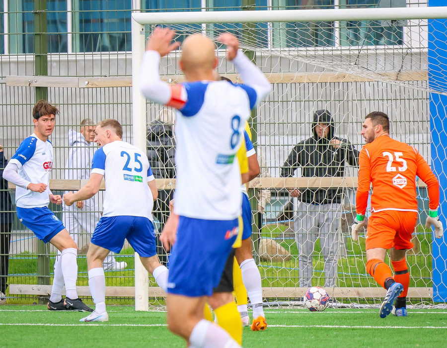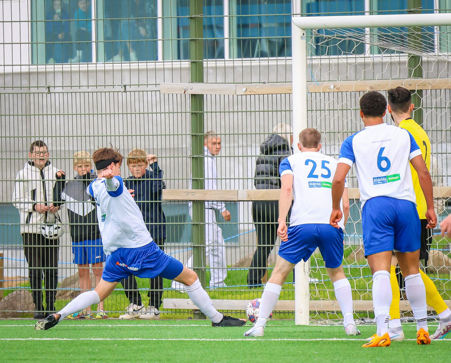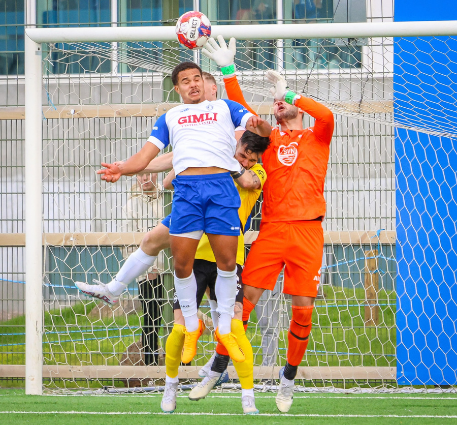 Klafs í markteignum. Boltinn dettur fyrir Hrafn sem skorar í autt markið!