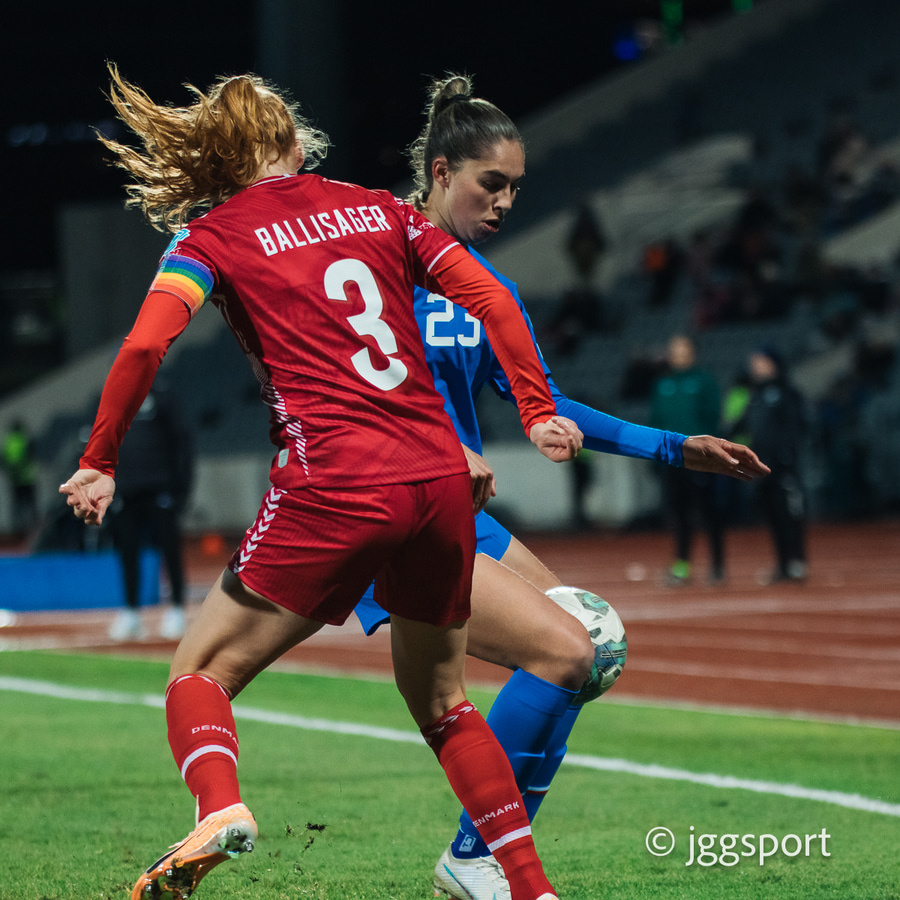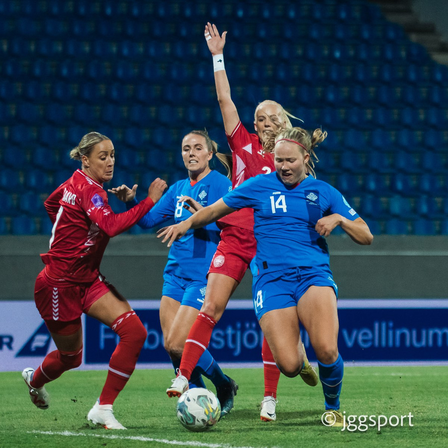 Ísland ógnar, Karólína Lea klobbar Katerine Veje og snýr í átt að marki, boltinn berst út til hægri á Guðnýju sem setur boltann fyrir markið. Danir skalla frá beint fyrir fætur Hildar Antonsdóttur sem á hörkuskot af varnarmanni og afturfyrir.