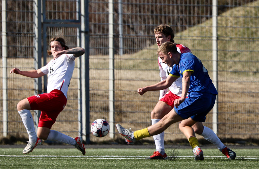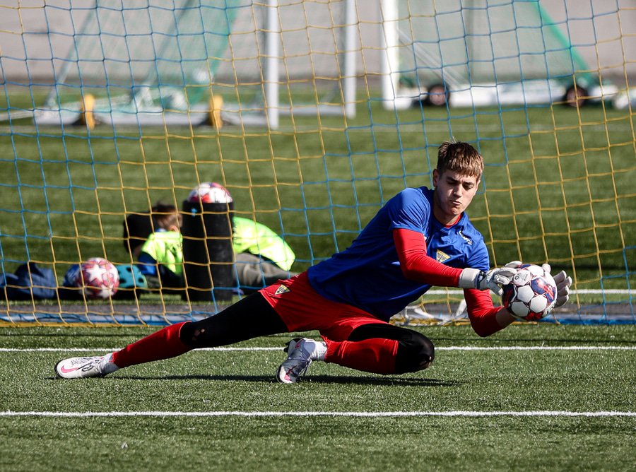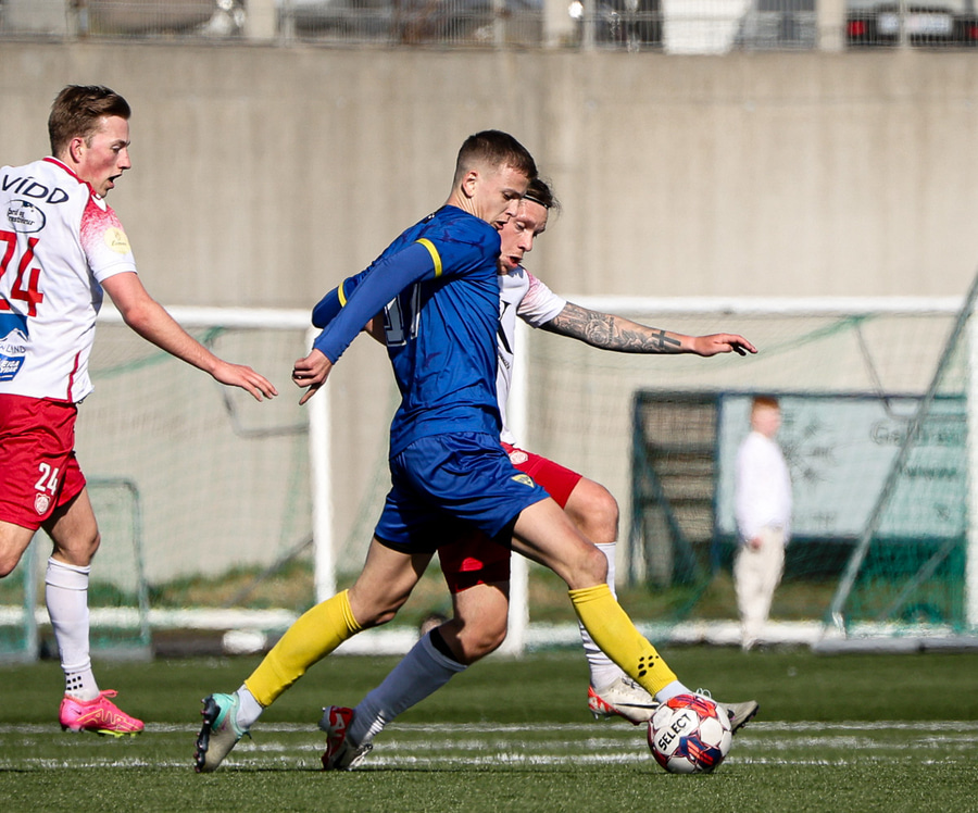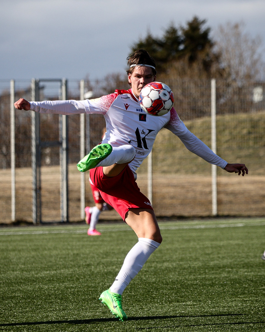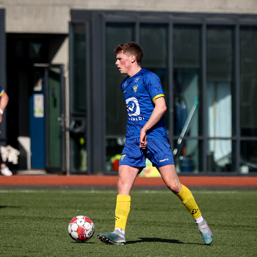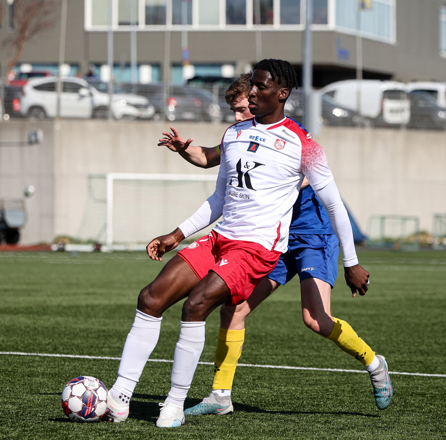 Kristófer Orri Pétursson í dauðafæri eftir laglega hælsendingu frá Tómasi Orra. Kristófer reynir að setja boltann undir Aron í markinu en Aron nær að verja!