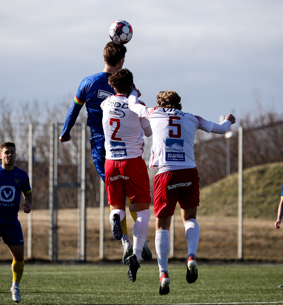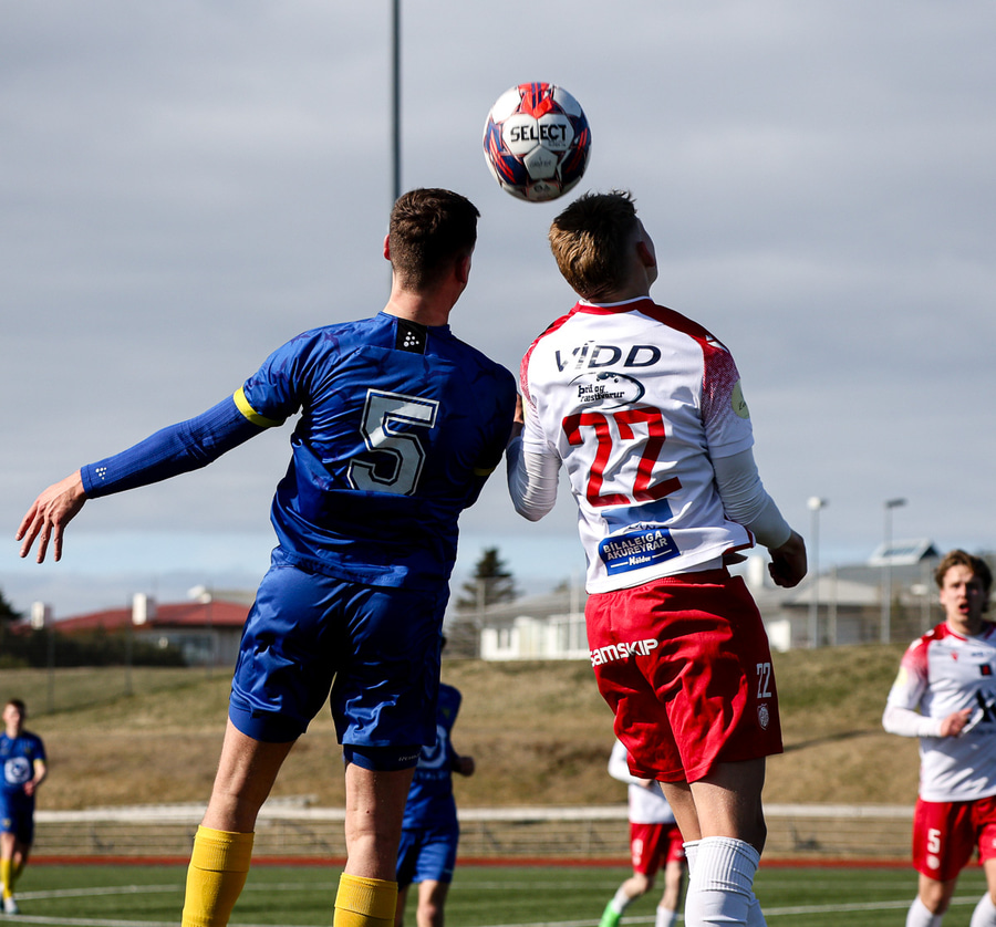 Sýndist það vera Arnar Daníel Aðalsteinsson sem átti nokkuð lúmskan skalla sem Aron þarf að hafa fyrir að slá yfir.