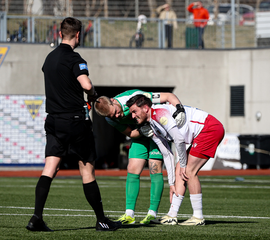 Tómas Orri Róbertsson fer niður eftir návígi við Fannar Daða Malmquist Gíslason . Ekkert dæmt.