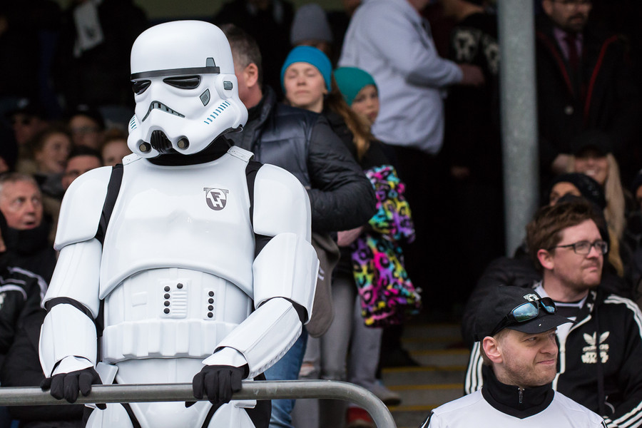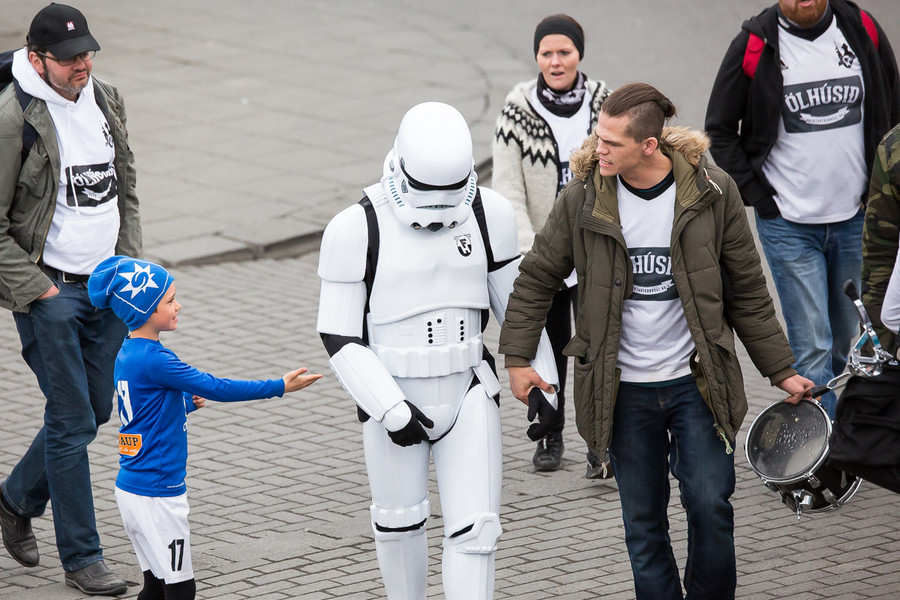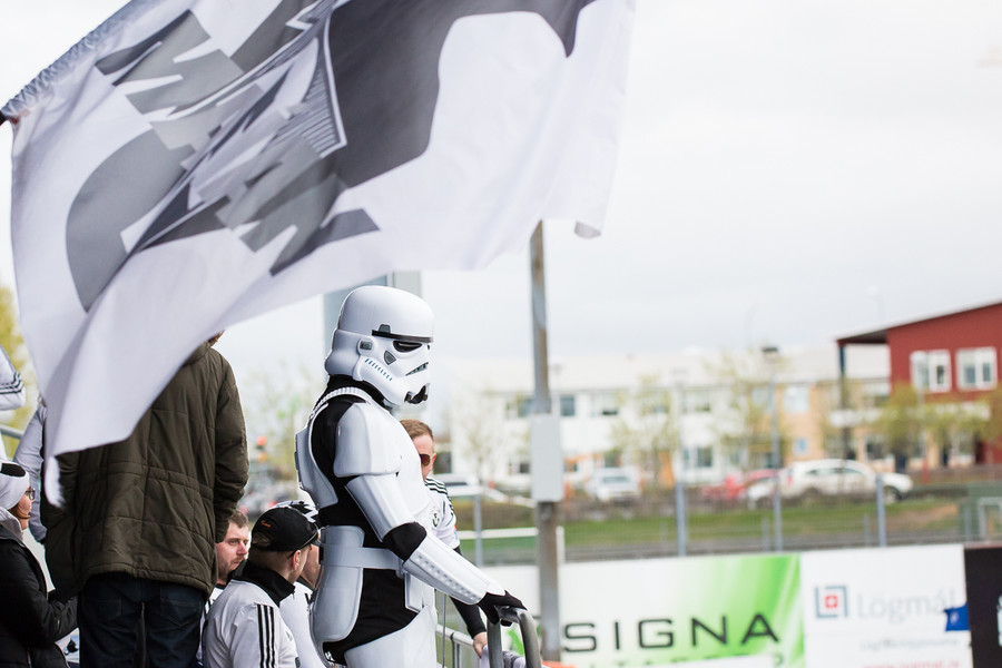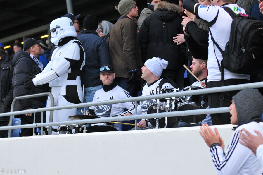 Stuðningsmaður FH í Storm Trooper búning að syngja Star Wars lagið. Vel gert.