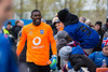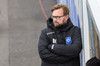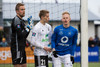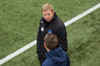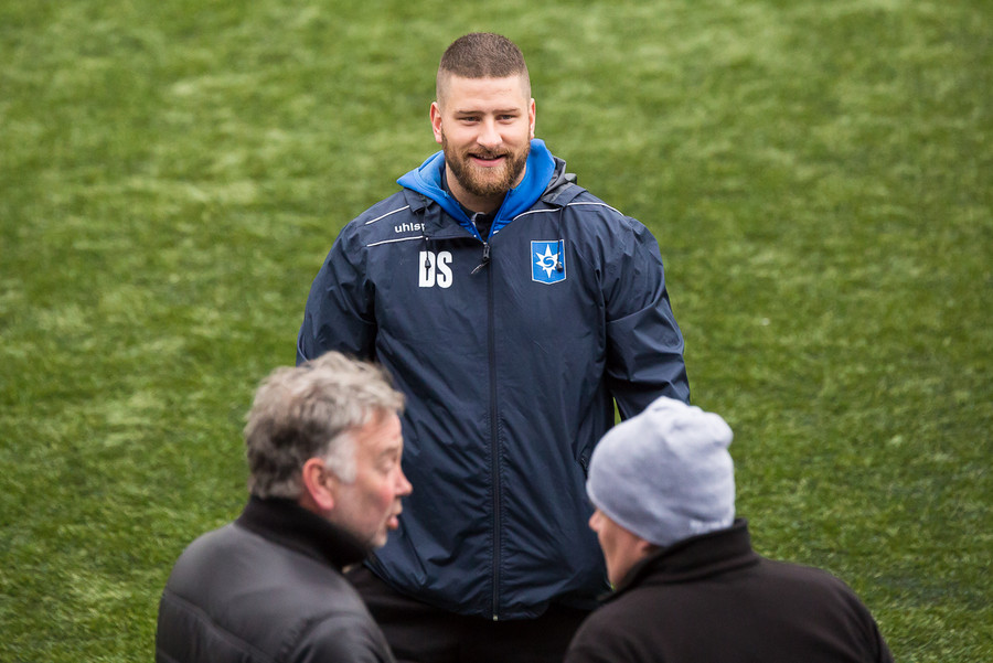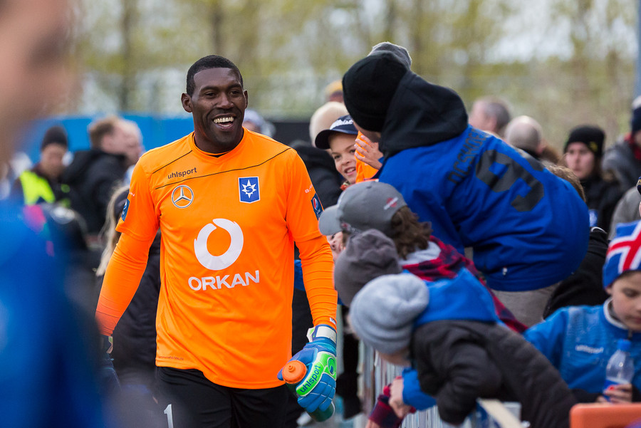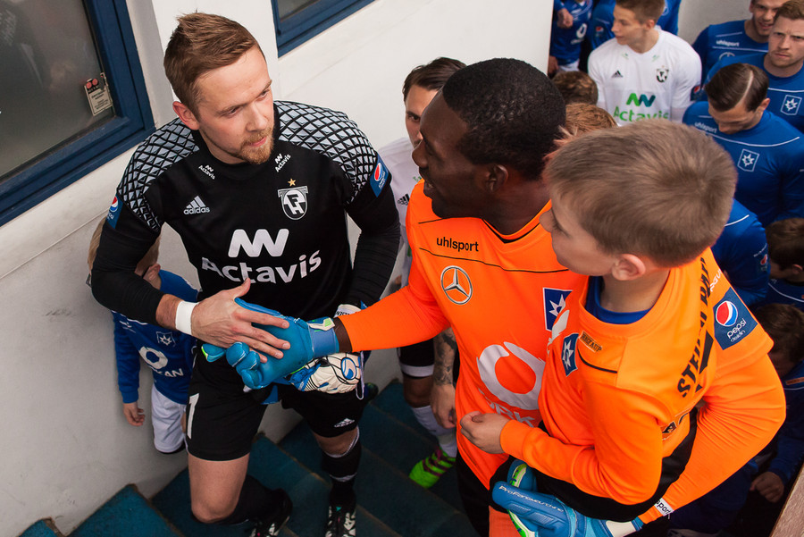 Liðin eru komin á völlinn. Duwayne Kerr er skærbroandi að þakka stuðningsmönnum Stjörnunnar fyrir góða stemningu. Gunnar Nielsen eitthvað minna glaður.